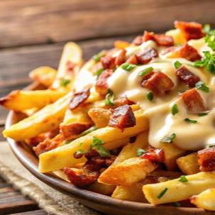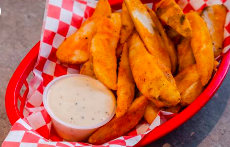 Papas fritas sazonadas en gajo con aderezo ranch.
