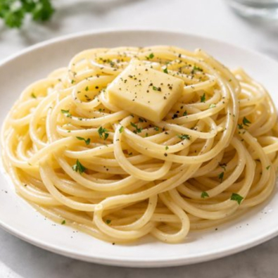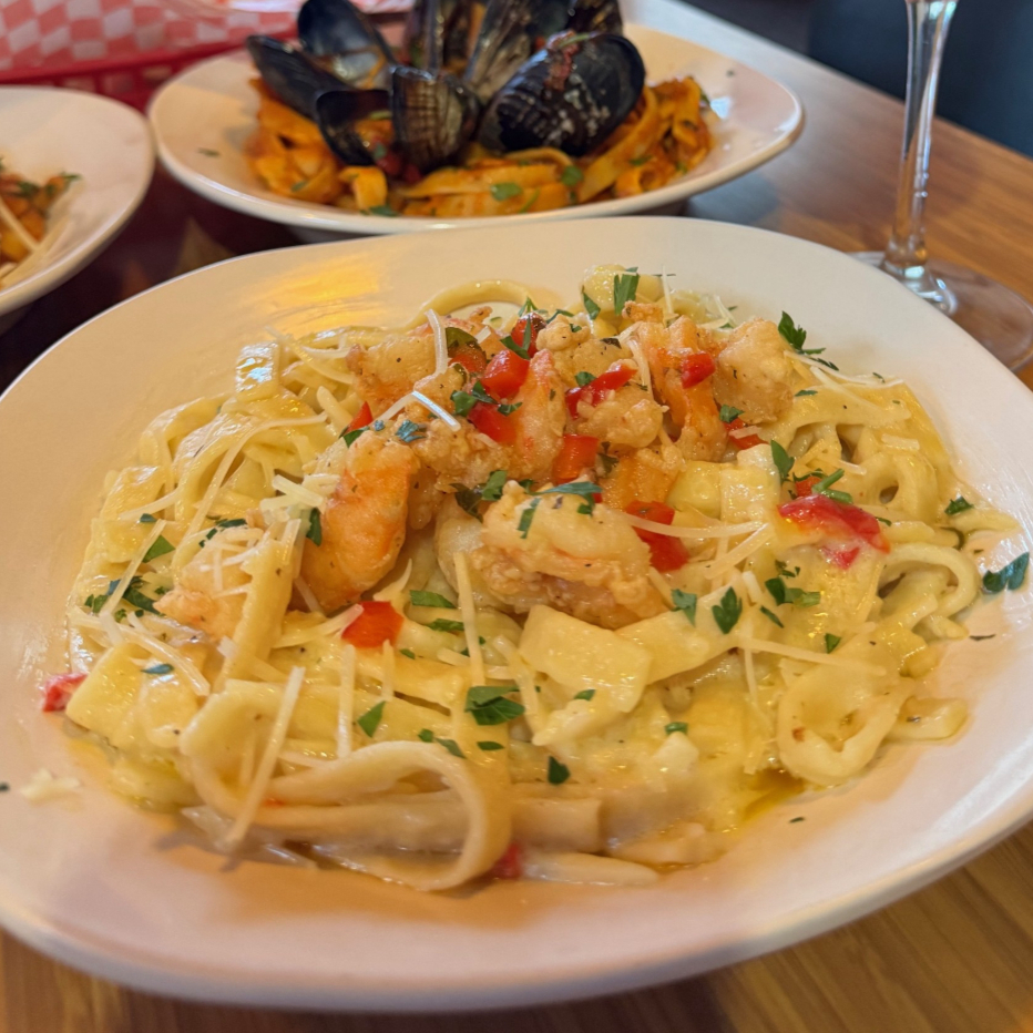 Deliciosa pasta Fettuccini al dente con camarones cocinados en mantequilla y ajo con especies, acompañado de Pan Tostado mantequilla