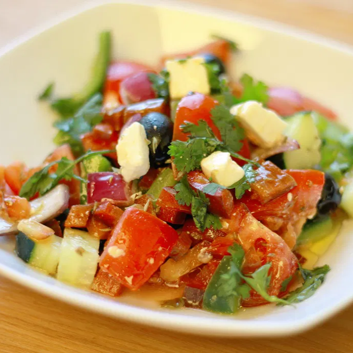 Pimientos, cebolla morada, pepinillos, tomate cherry, aceituna negra, queso fetta y aderezo vinagreta.