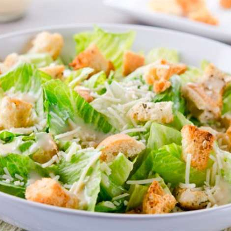 Croutones, queso parmesano, lechuga romana y aderezo cesar.