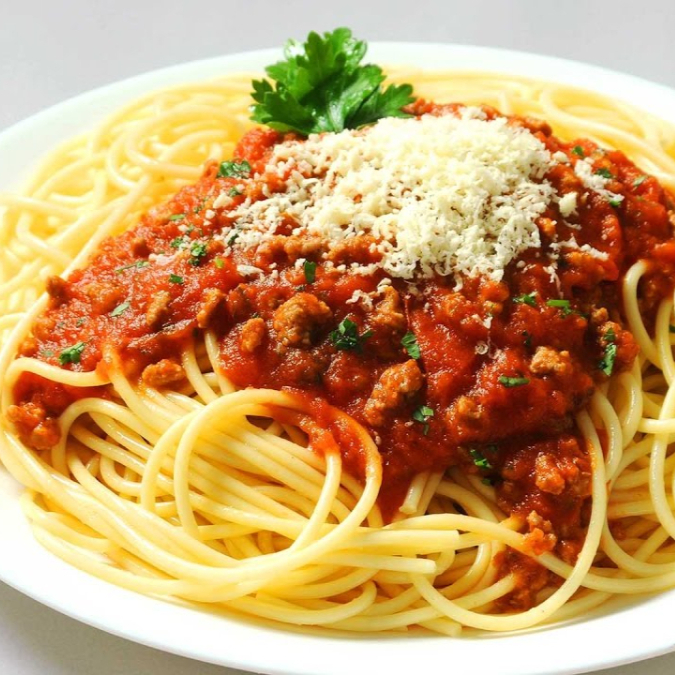 Spaguetti a la bolognesa con jugosa salsa, carne molida y salsa de tomate.