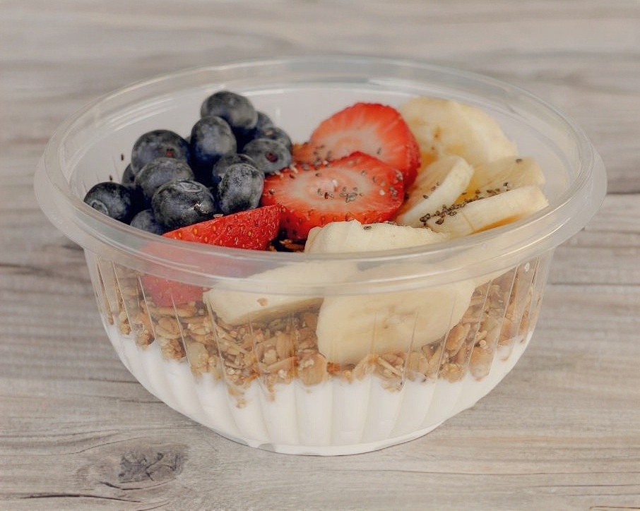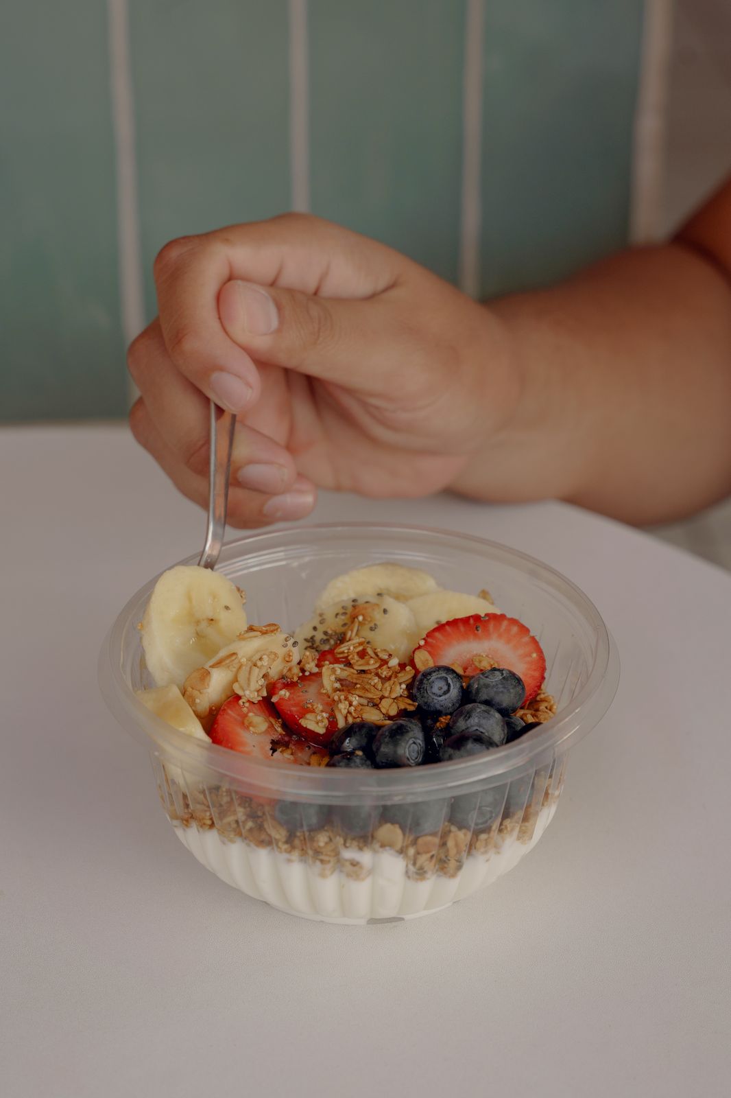 Berries, fresa, plátano, crema de cacahuate, chía, leche de coco.