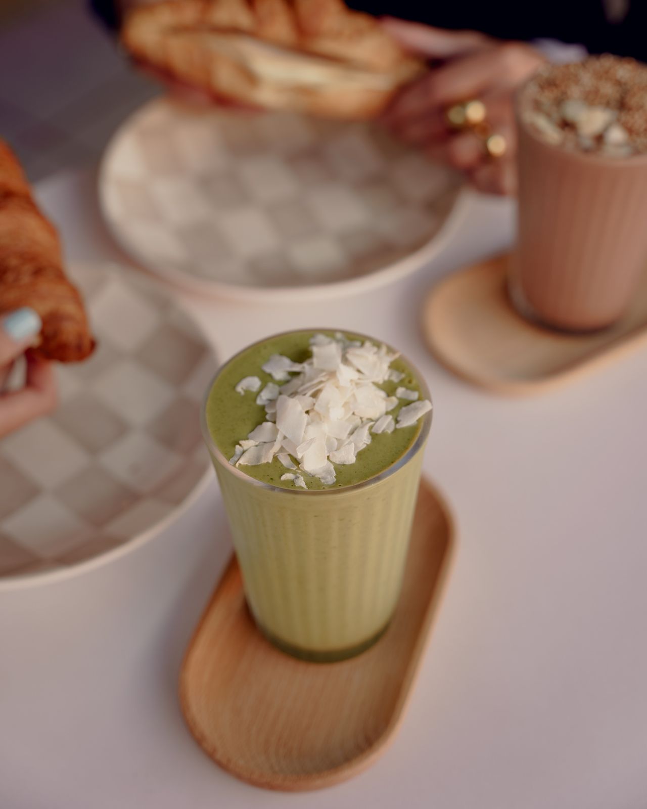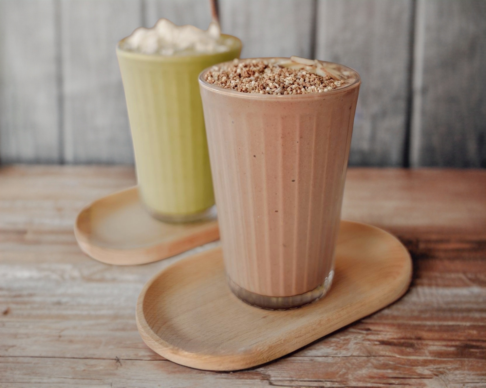 Matcha orgánico, kale, crema de almendra, plátano, proteína, leche de coco.