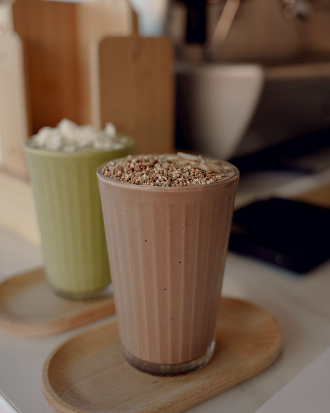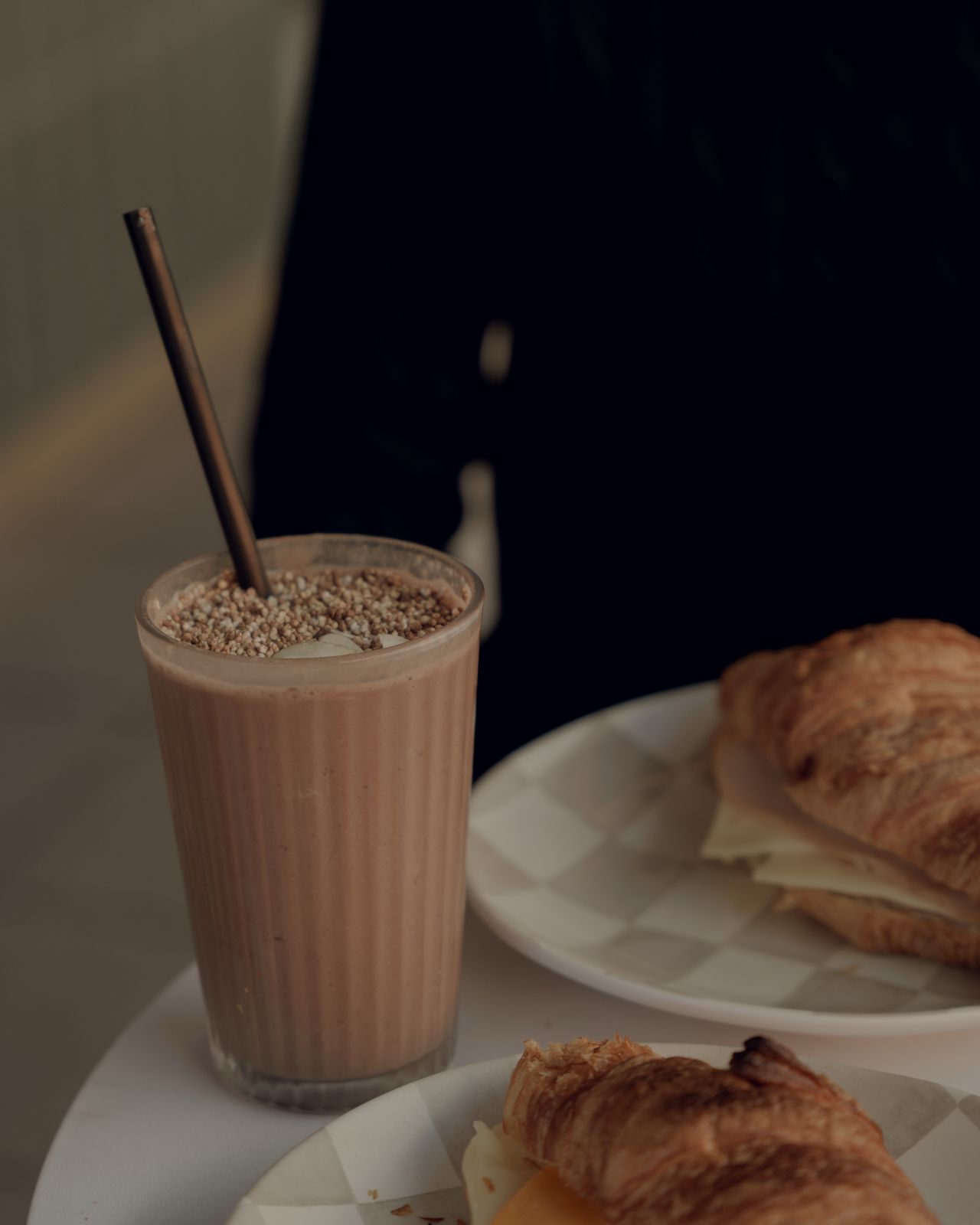 Shot espresso, cacao 0% azúcar, plátano, leche de almendra, hielo y proteína.