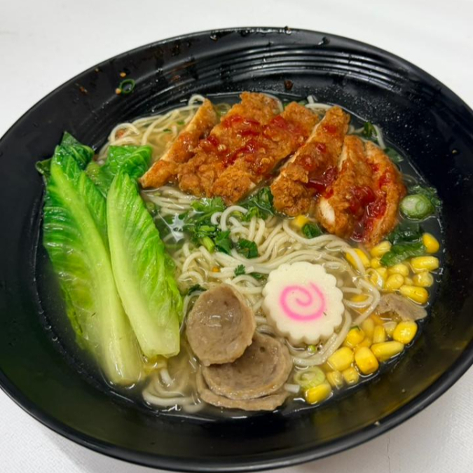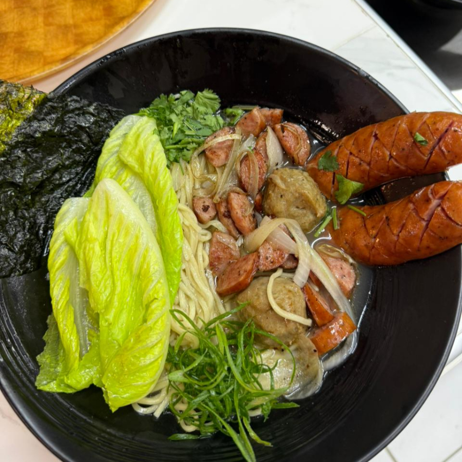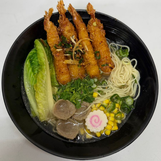 Ramen de pecho de res,naruto,albondiga de res,elote lechuga,aceite especial de la casa ,cebollin y cilantro