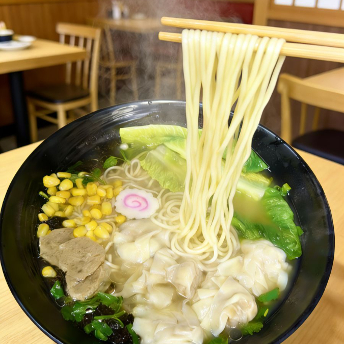 wonton relleno de cerdo con verdura,albondiga de res,elote,naruto,cebollin,cilantro,lechuga aceite especial de la casa