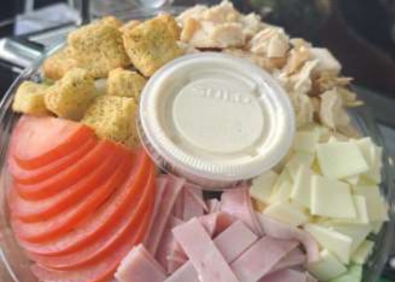 200 g. De deliciosa ensalada jardinera con 50 g de jamón, 40 g de queso manchego, 80 grs de pechuga de pollo en cubos, 30 gr de jitomate, 30 g de crutones parmesanos y aderezo ranch.