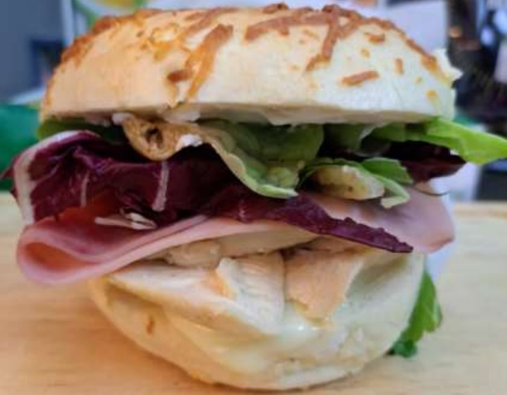 Pan bagel con costra de queso Philadelphia, 80 g de pechuga de pollo, jamón, queso manchego, lechuga, germinado, jitomate, chiles en vinagre, mostaza y mayonesa .