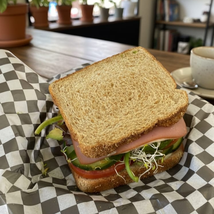 pan integral, mayonesa, jamon, pechuga de pollo, queso manchego, pepino, tomate, cebolla, germinado, aguacate, lechuga .