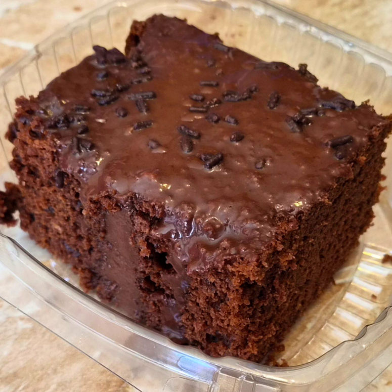 Rebanada de pastel de chocolate con mousse de chocolate y chispas de chocolate.