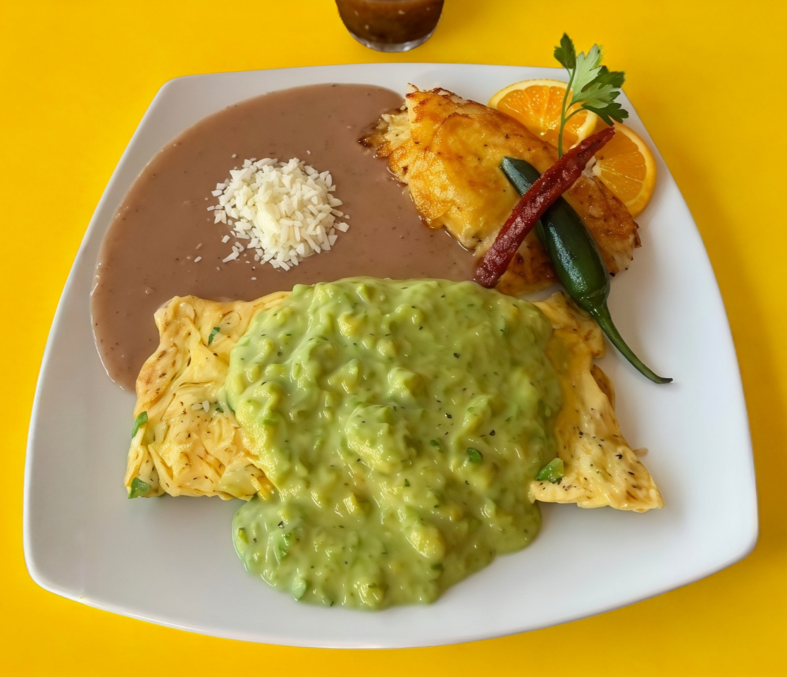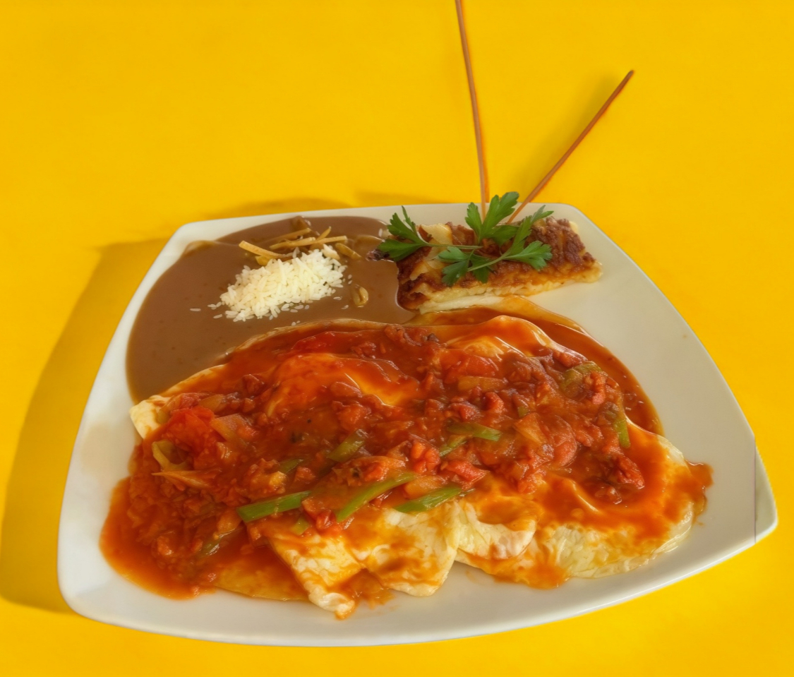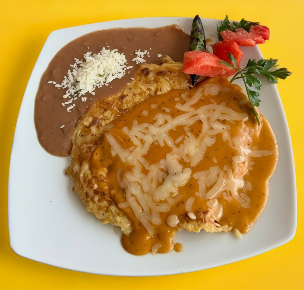 BASE DE TORTILLA CON JAMON, MONTADO CON DOS HUEVOS ESTRELLADOS VOLTEADOS BAÑADOS CON UNA EXCELENTE SALSA CASERA DE CHORIZO.