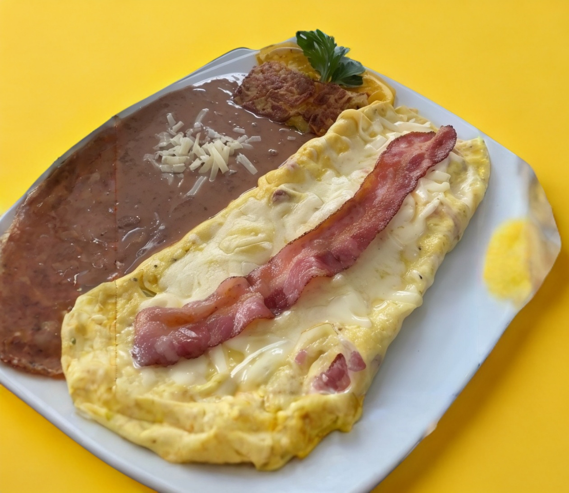 Omelete de tocino con queso monterrey, acompañado de papa hash brown y frijoles.