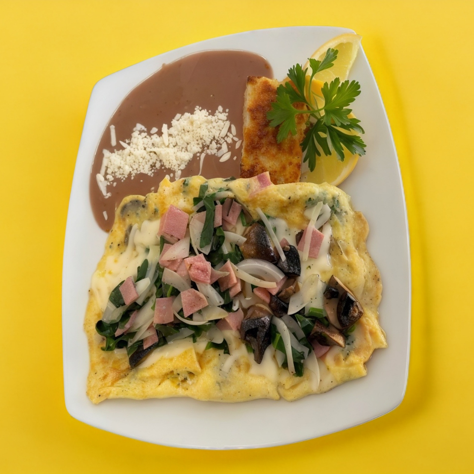 Omelete de Jamon, Champiñones,Cebolla Y Queso.