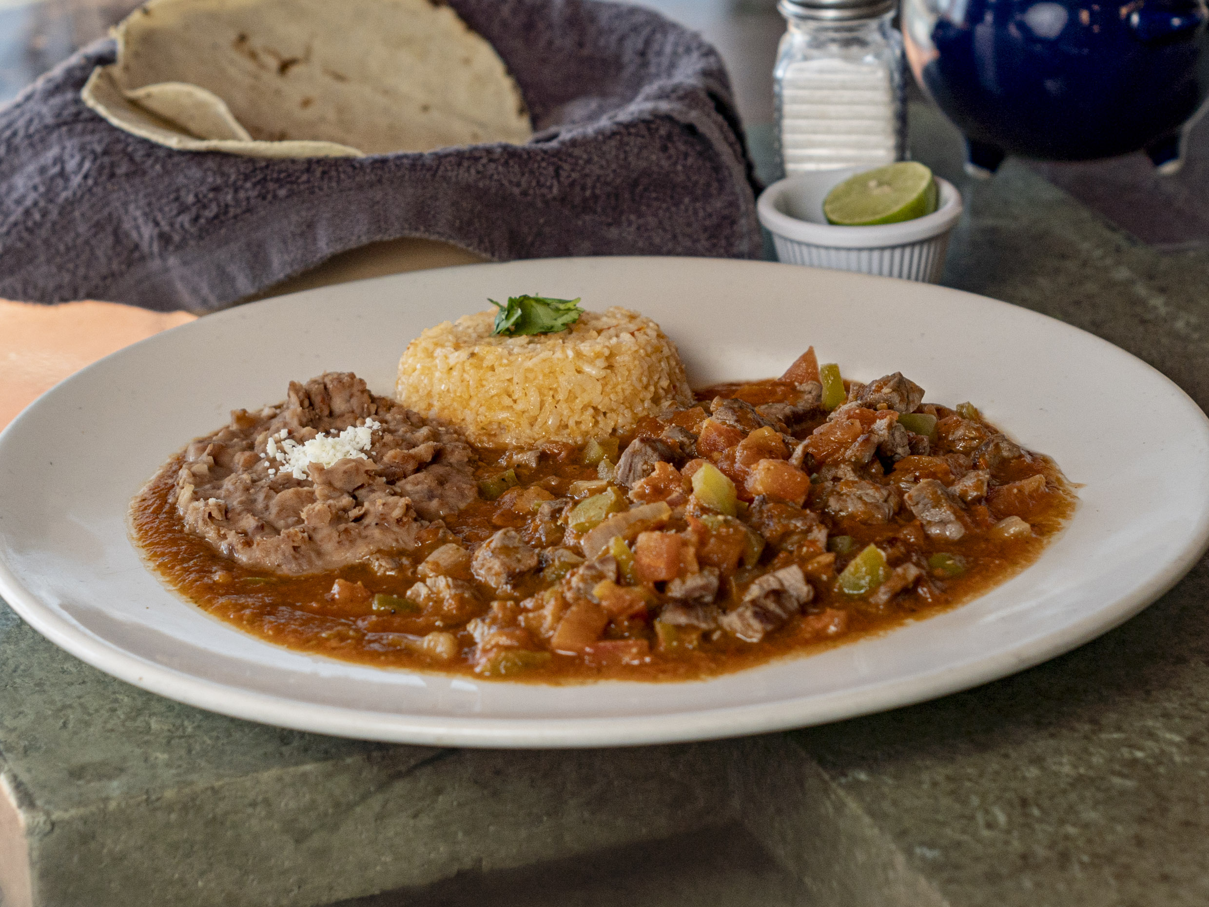Relleno de carne desebrada con tomate, cebolla y chile gratinado. Acompañado con chilaquiles rojos con queso y crema. Frijol y papa campirana.