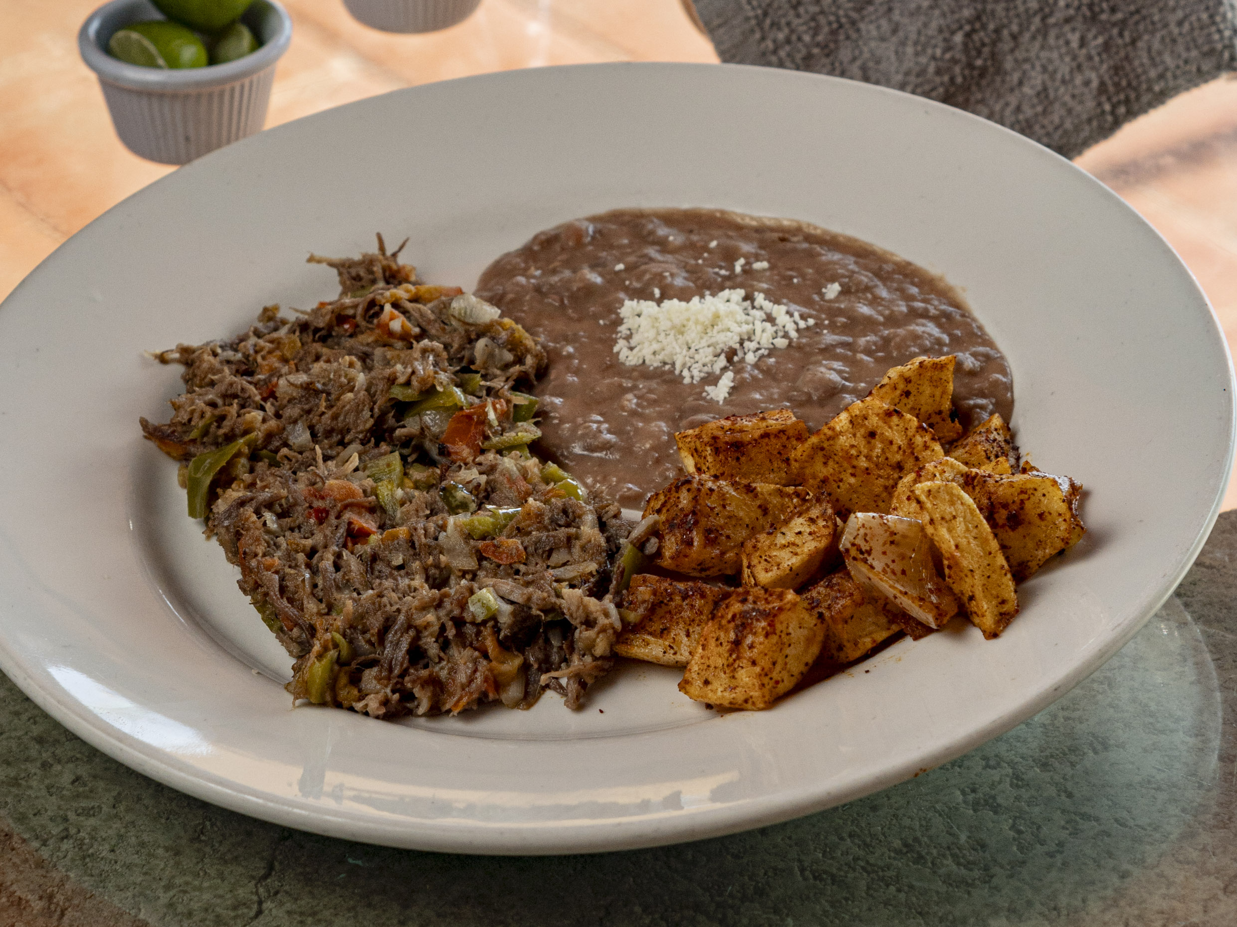 Machaca desebrada mezclada con huevo y verdura (tomate, cebolla y chile california) Papa campirana y frijol.