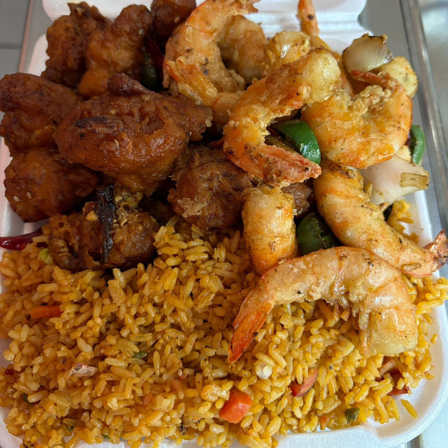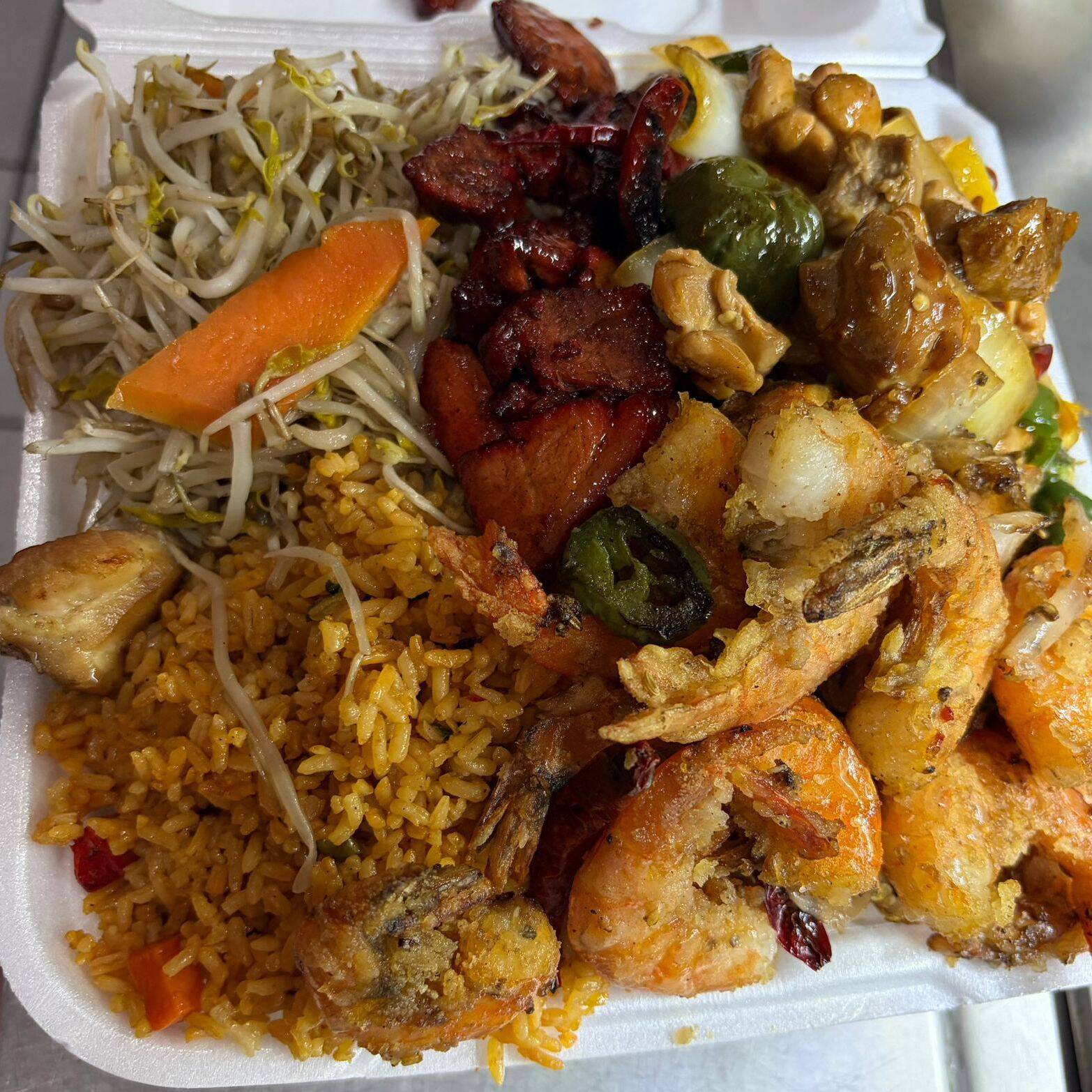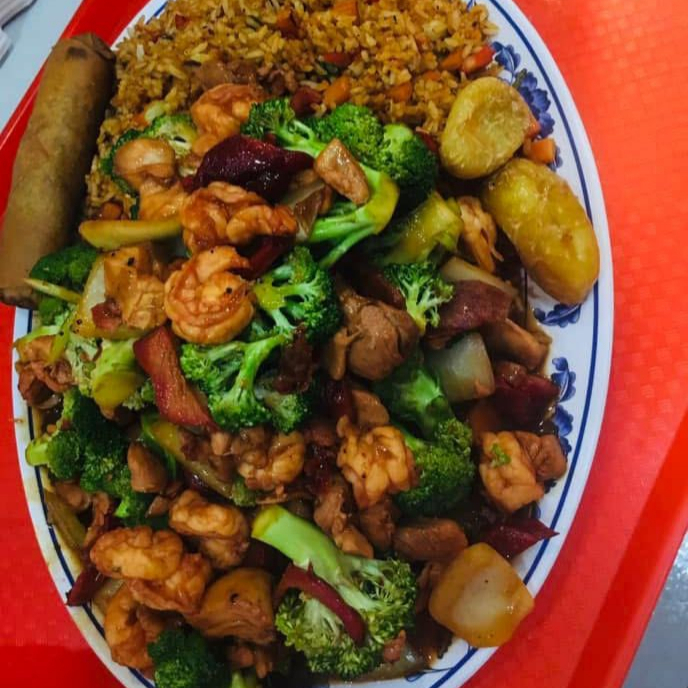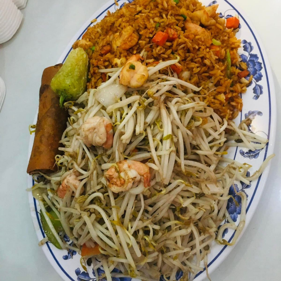 Arroz con camarón, chop suey con camarón y chun kun con chile asado.