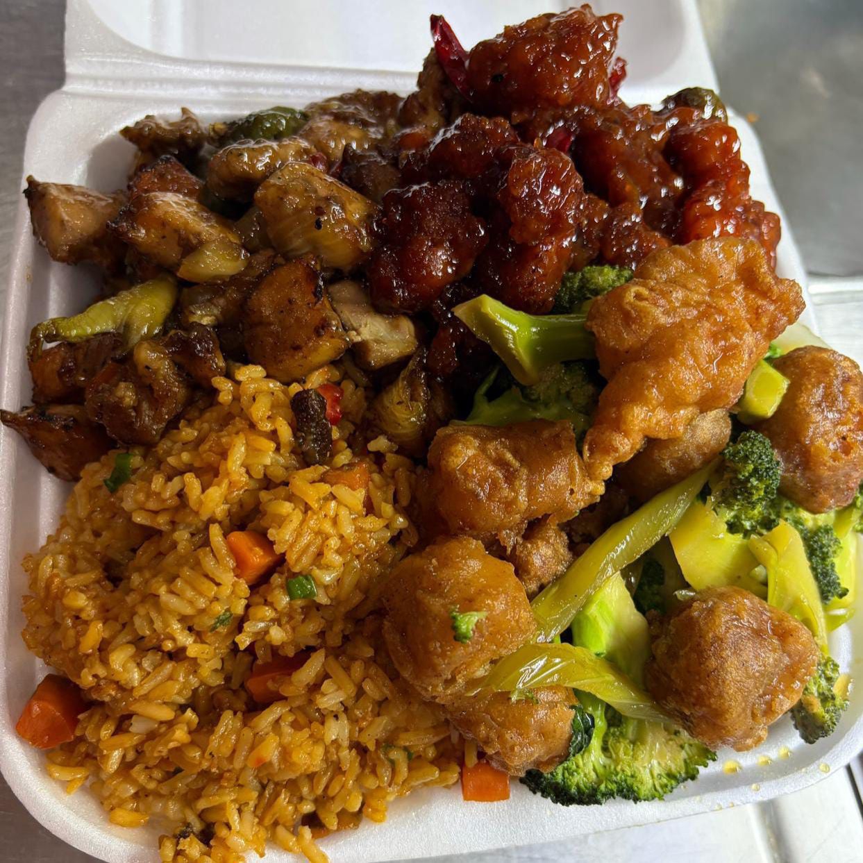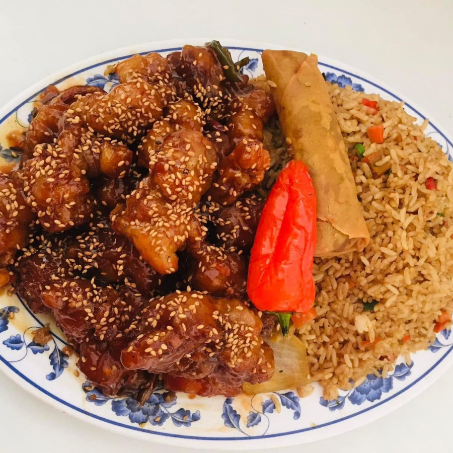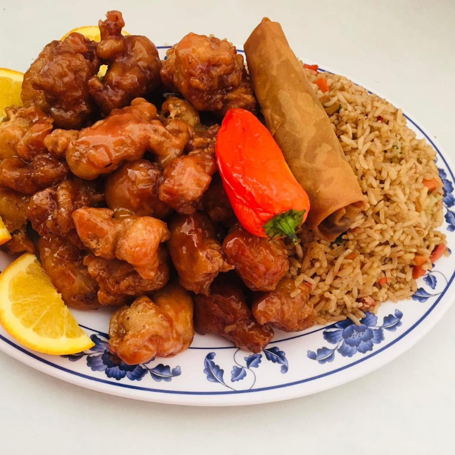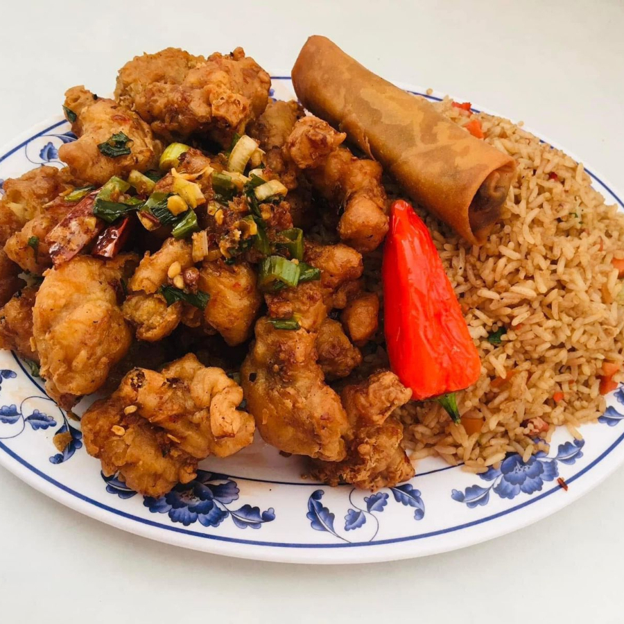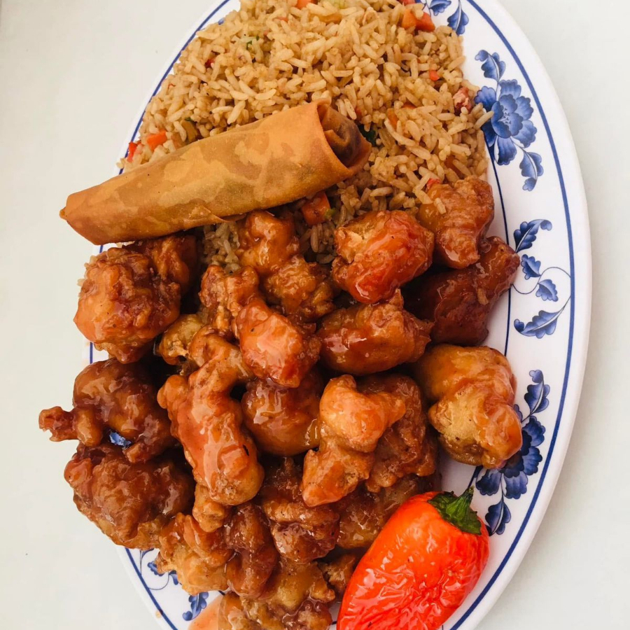 Arroz con carnitas, pollo a la naranja y chun kun con chile asado.