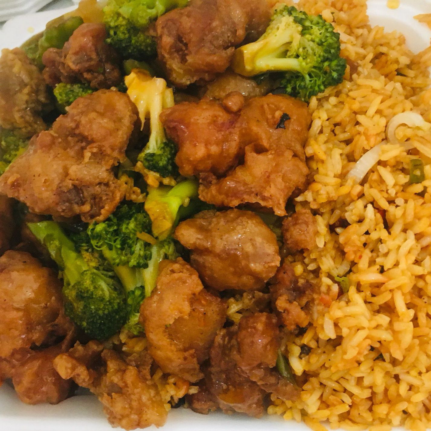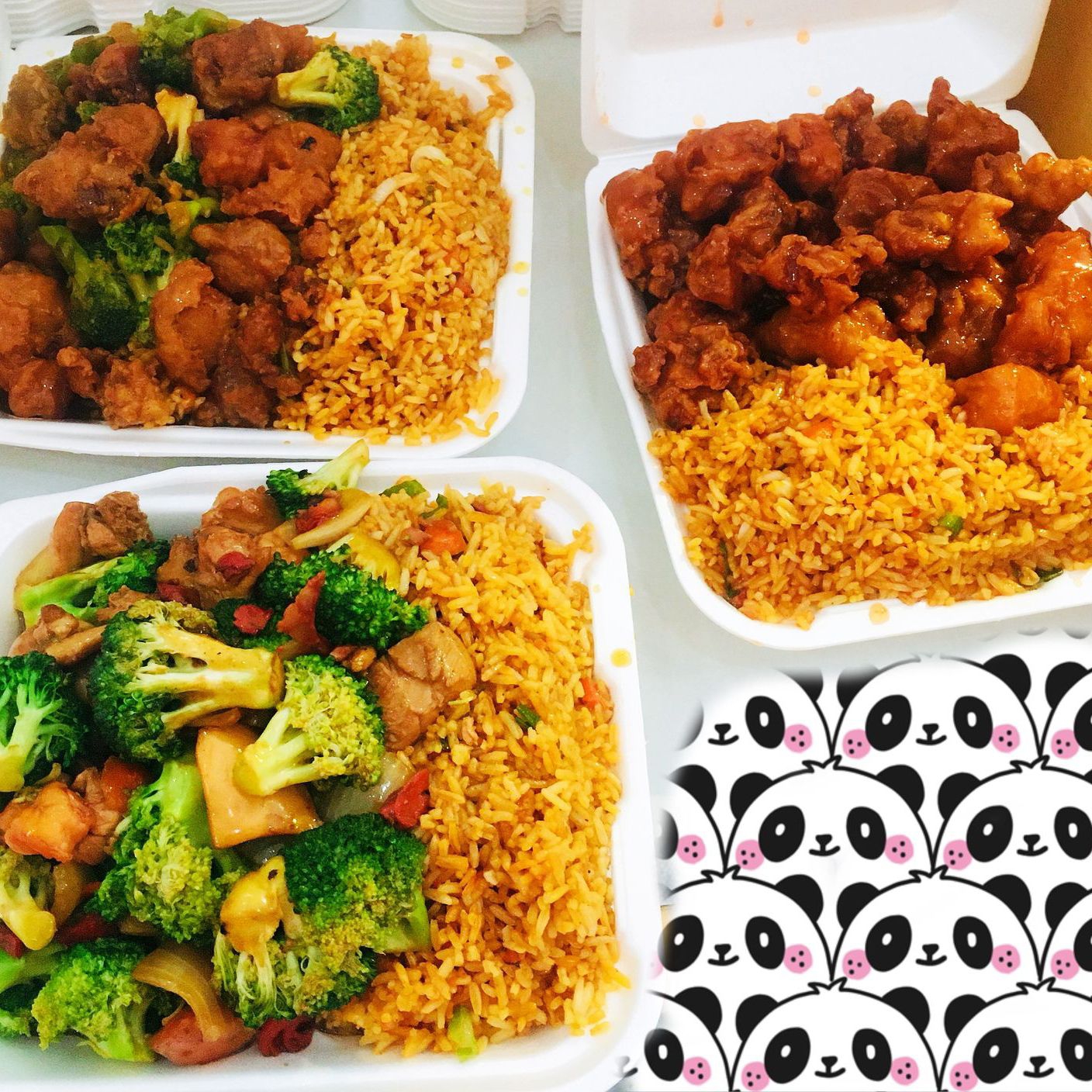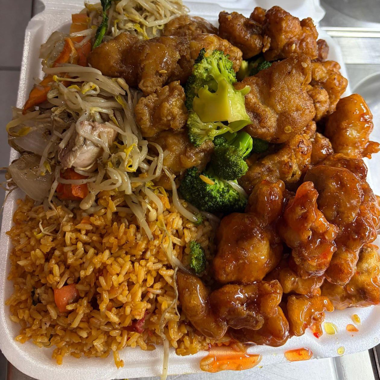 Arroz con carnitas, pollo a la naranja y chun kun con chile asado.