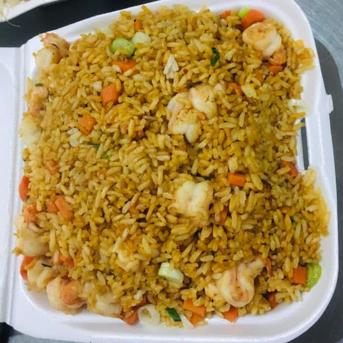 Porción individual de arroz frito, salteado con camarones frescos.
