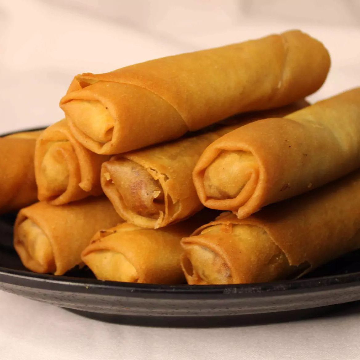 Crujiente rollito primavera, relleno de vegetales picados y carne, frito a la perfección.