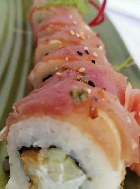 Rollo relleno de queso crema aguacate camarón tempura y surimi preparado forrado de salmón, con rodajas de serrano