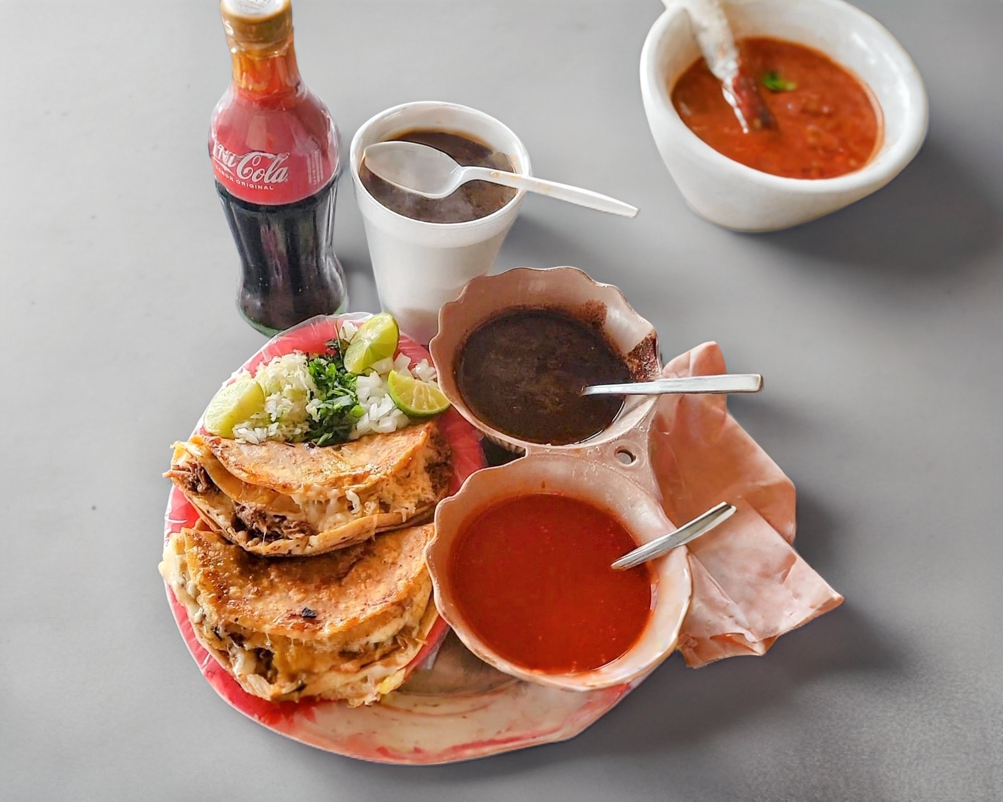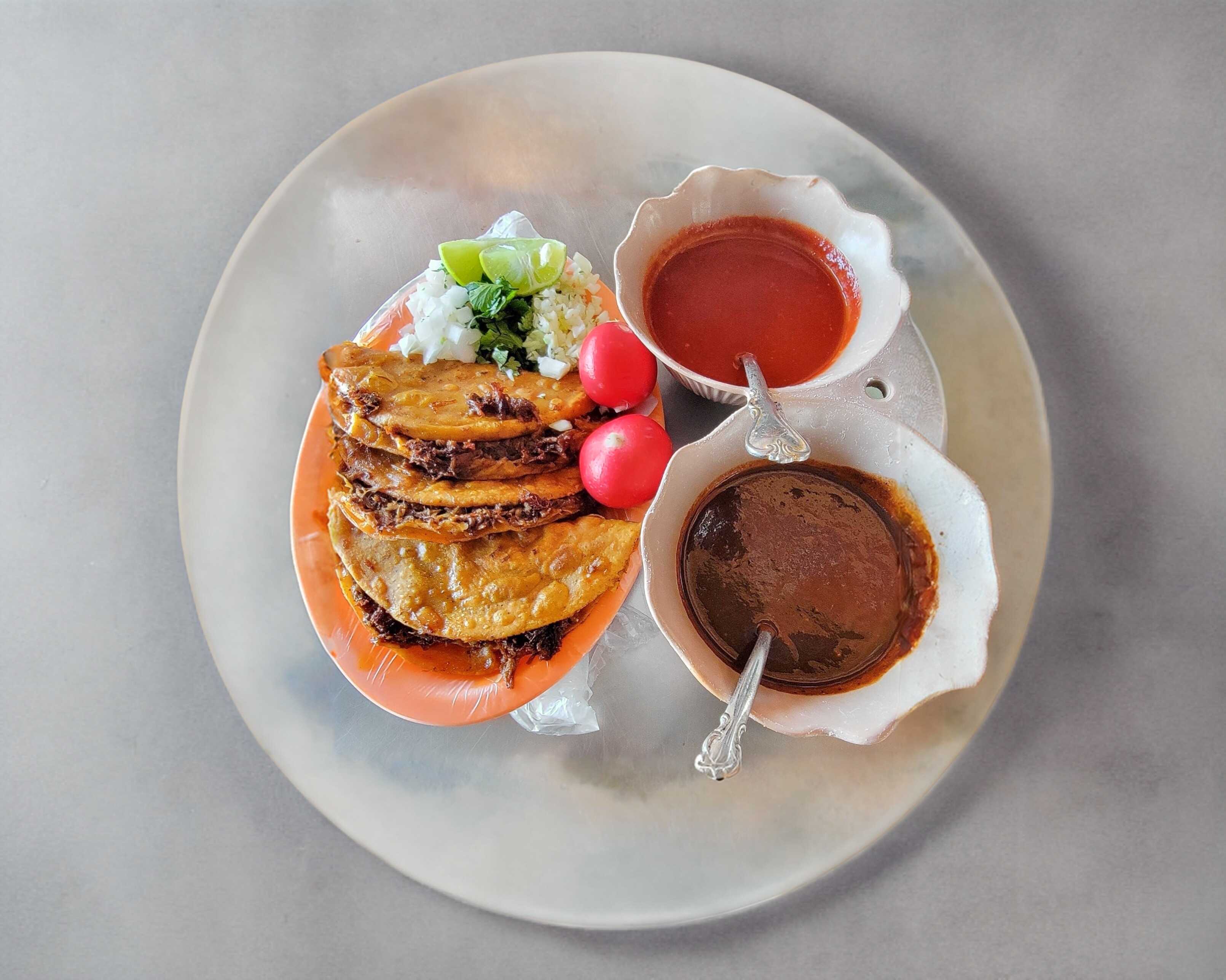 Tortilla de maíz dorada a la mitad con sabor a birria y carne de cabeza acompañado de verdura aparte (cilantro, cebolla, repollo y limón), salsa roja o salsa de tomatillo tatemada.
