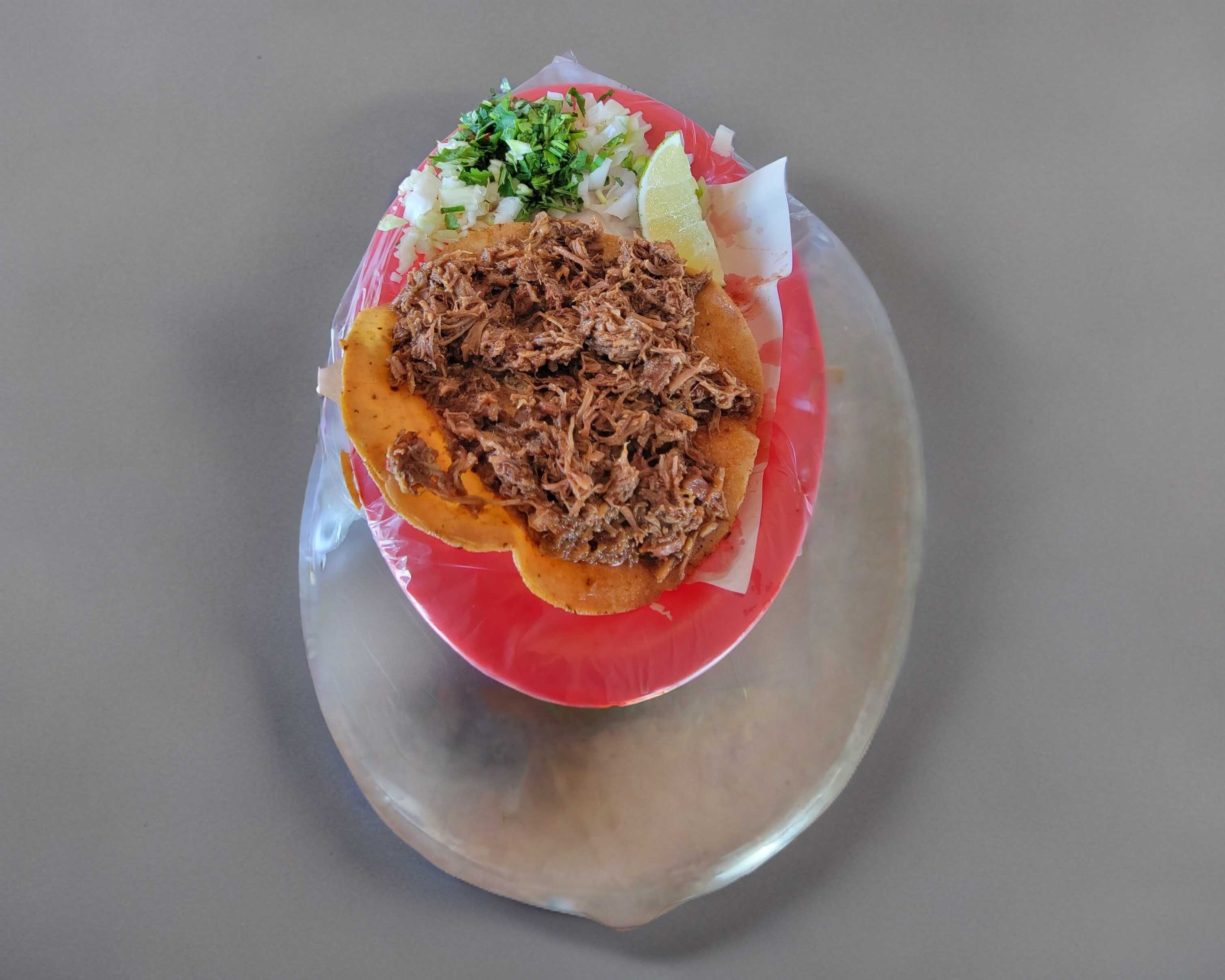 Tortilla de maíz tostada con sabor a birria y carne de res acompañado de verdura (cilantro, cebolla, repollo y limón), salsa roja o salsa de tomatillo tatemada.