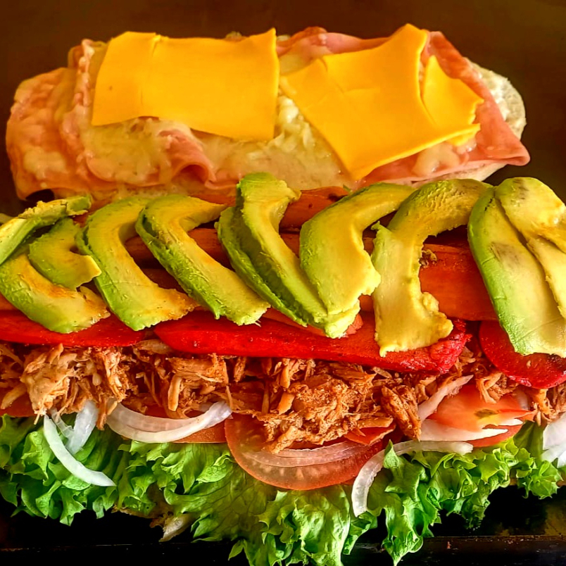 Doble pollo , jamón , queso Monterrey, queso amarillo, aguacate,lechuga, tomate y cebolla