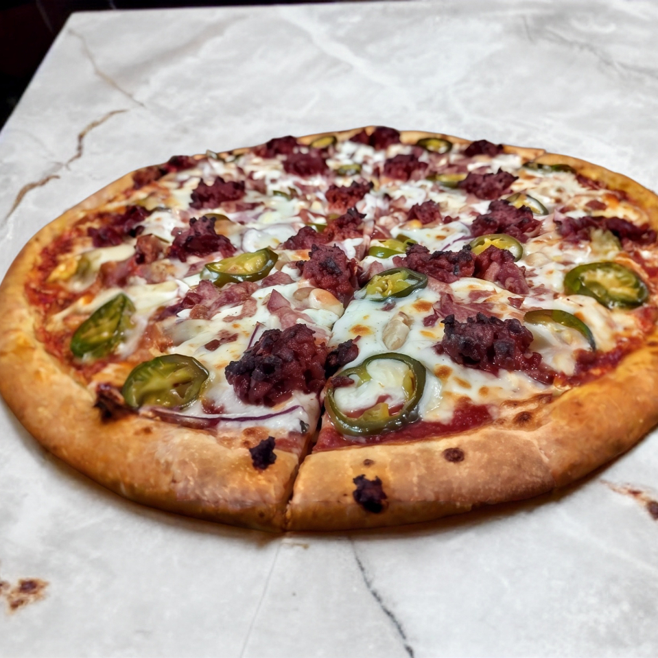 Tocino,Chorizo,Jalapeños,Frijoles.Cebolla Morada