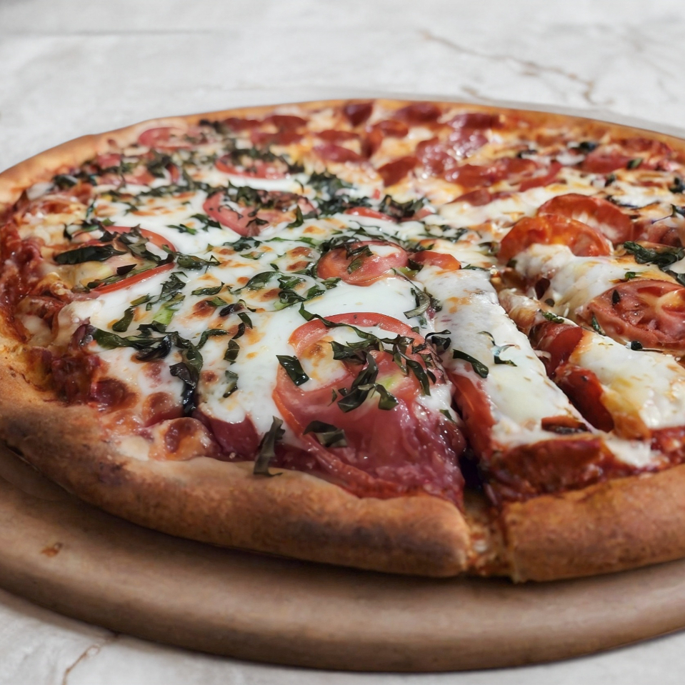 Tomate, Cebolla Morada, Aceituna Negra, Albahaca, Ajo Molido, Pimiento Verde, Champiñones.