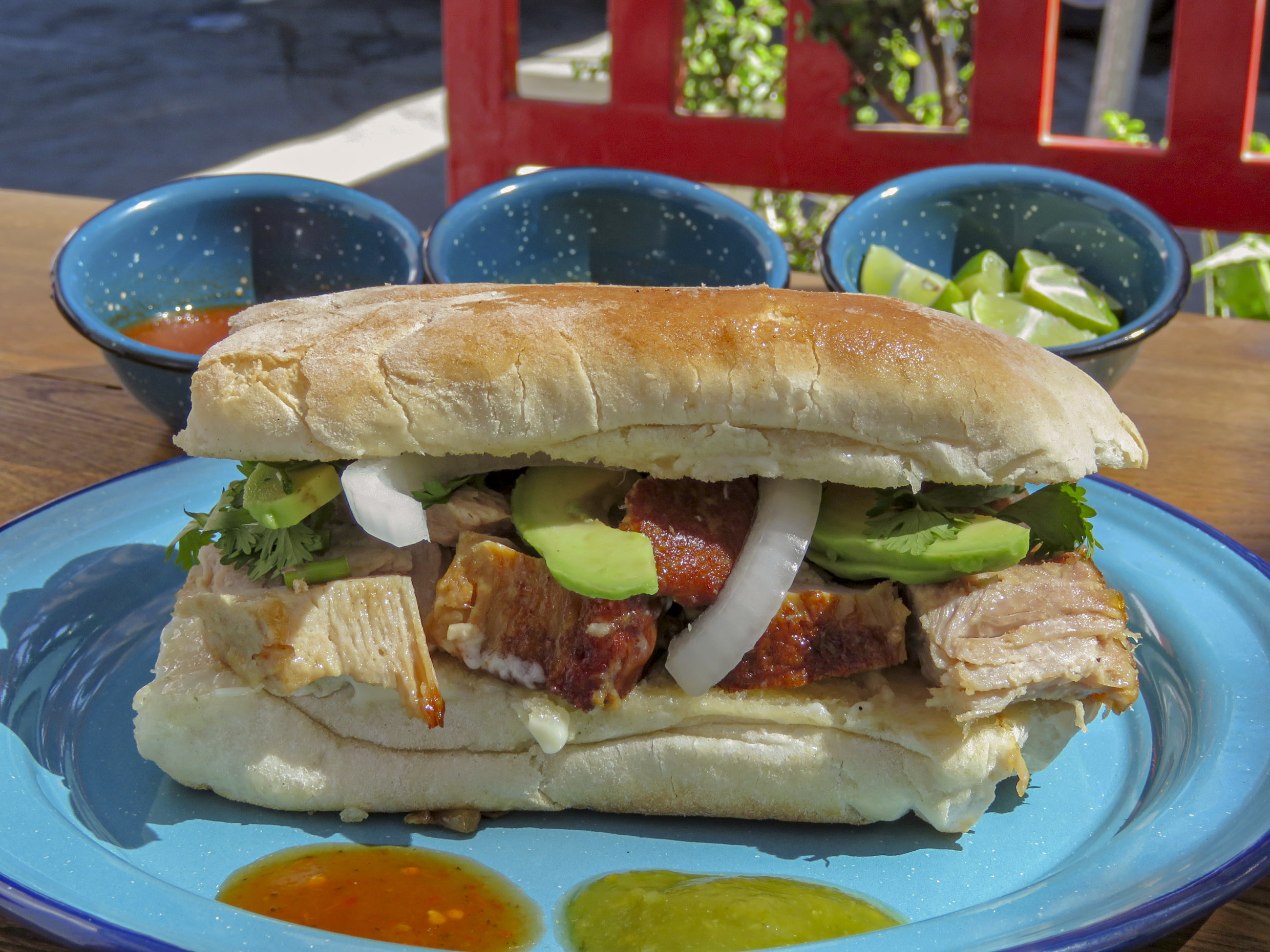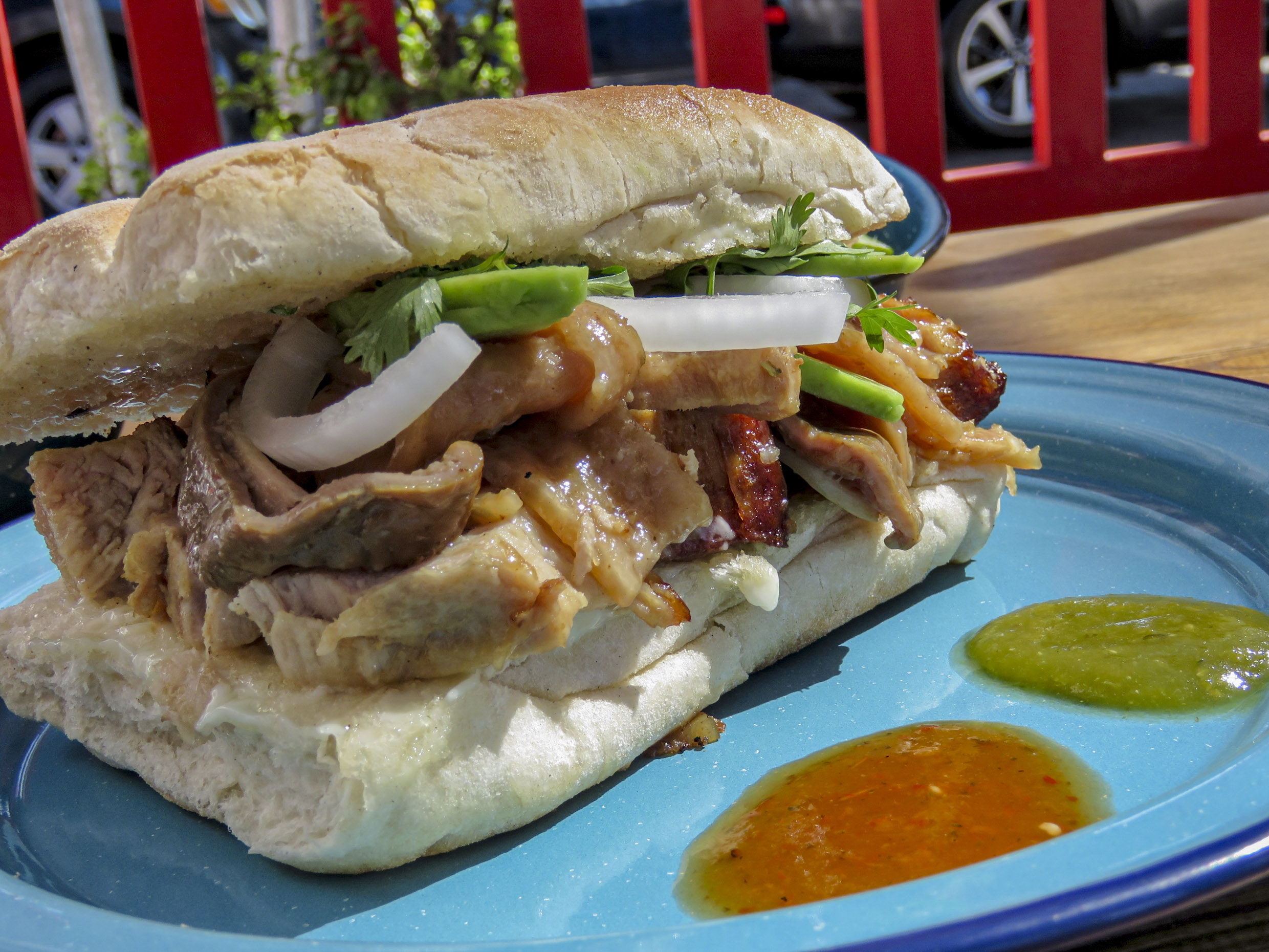 Lleva queso, jamon, chorizo, mayonesa, tomate, cebolla y aguacate. Aparte salsa (verde y roja) y limon.