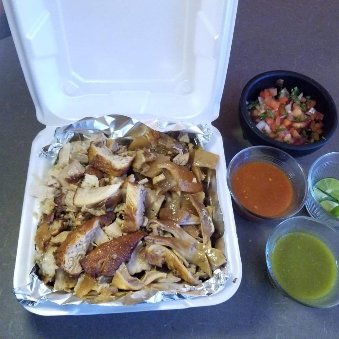 Incluye salsa (verde y roja), verdura (bandera), limones y tortillas (250 gr, aprox.)