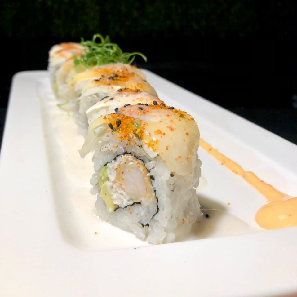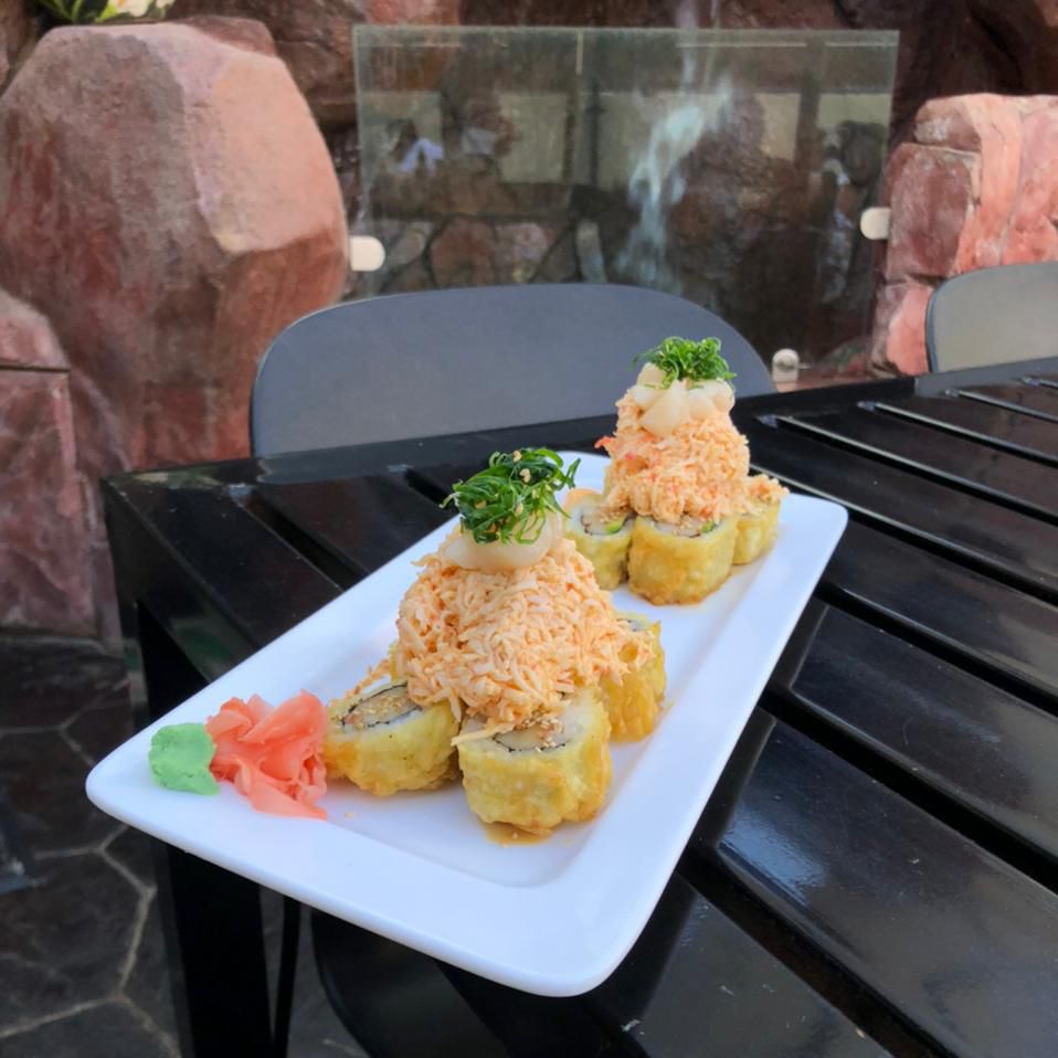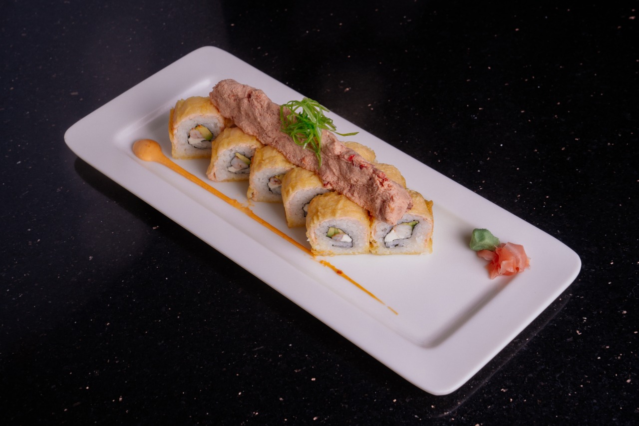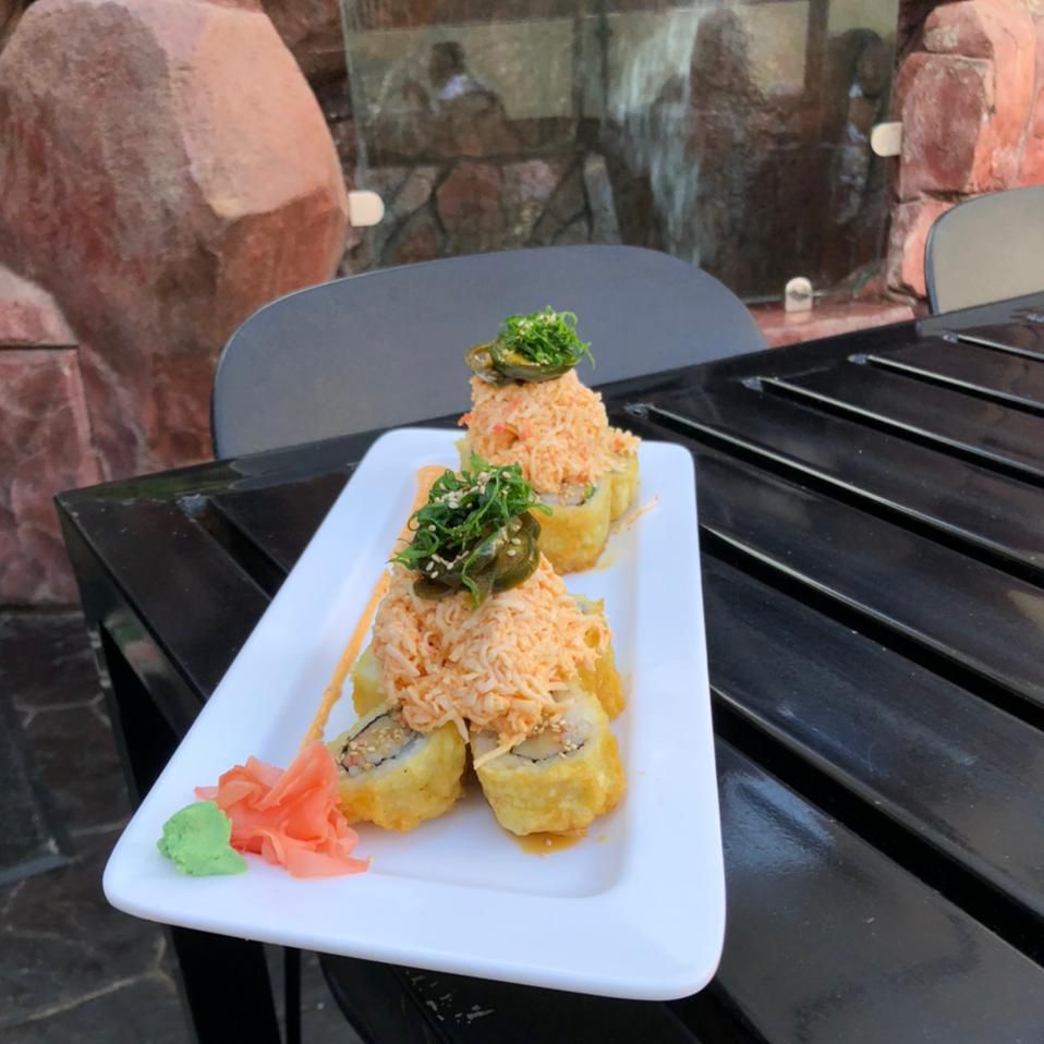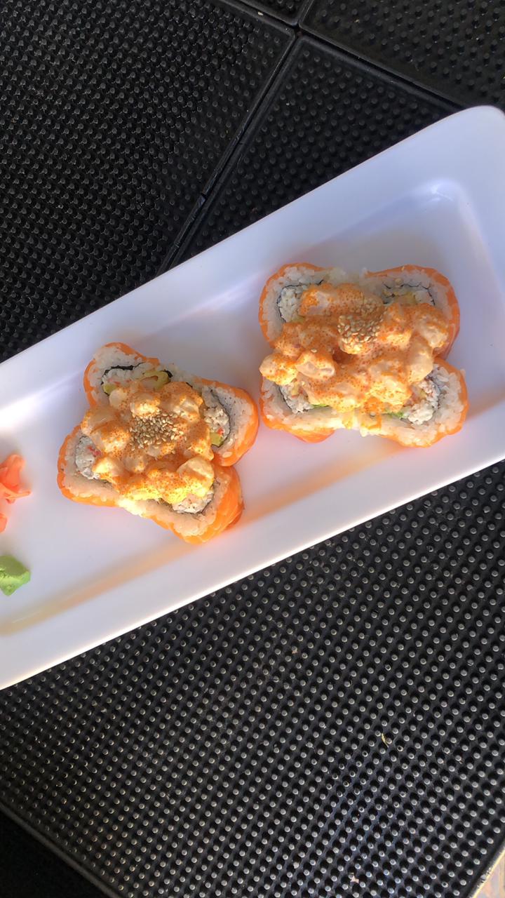 Surimi, camarón tempura, queso y aguacate, por fuera Salmón con toping de callo masago spicy.