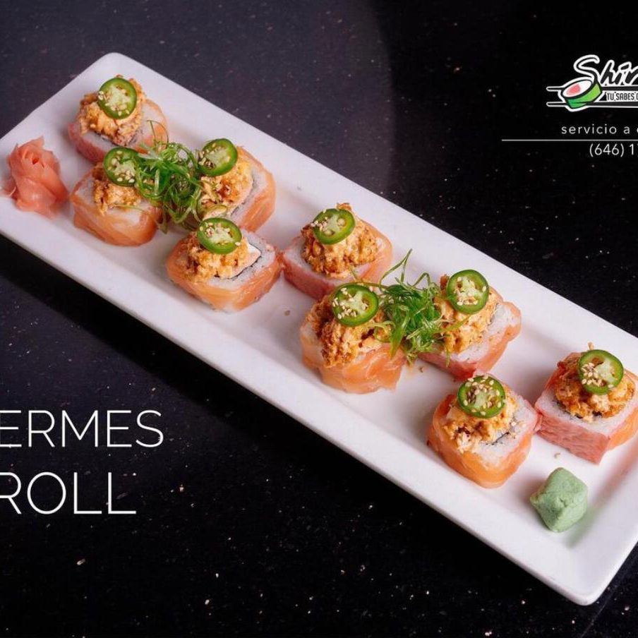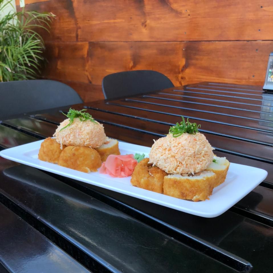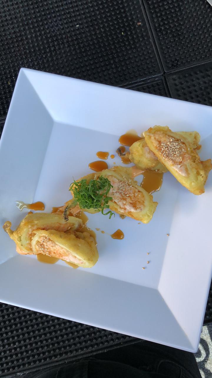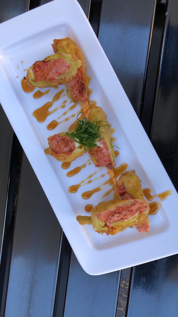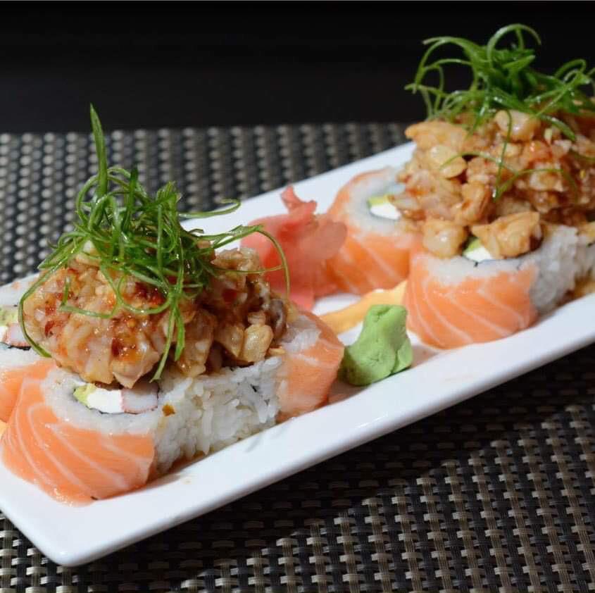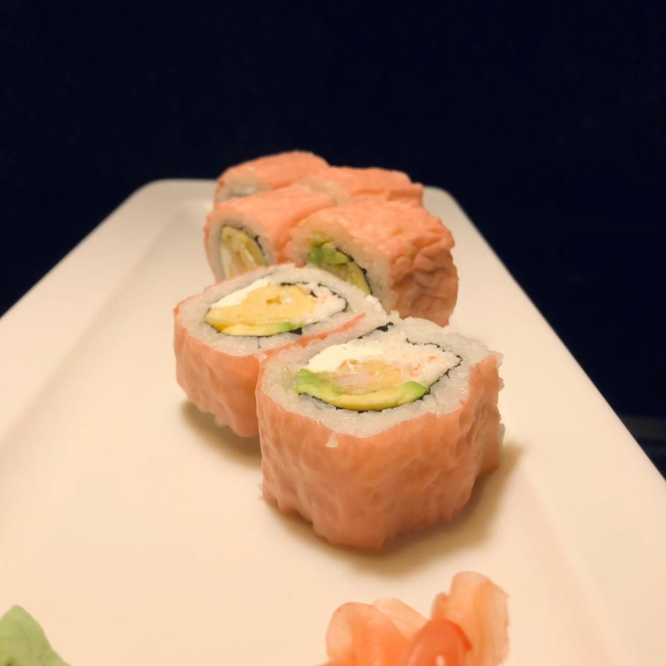 Surimi, camarón tempura, queso y aguacate, por fuera Salmón con toping de callo masago spicy.