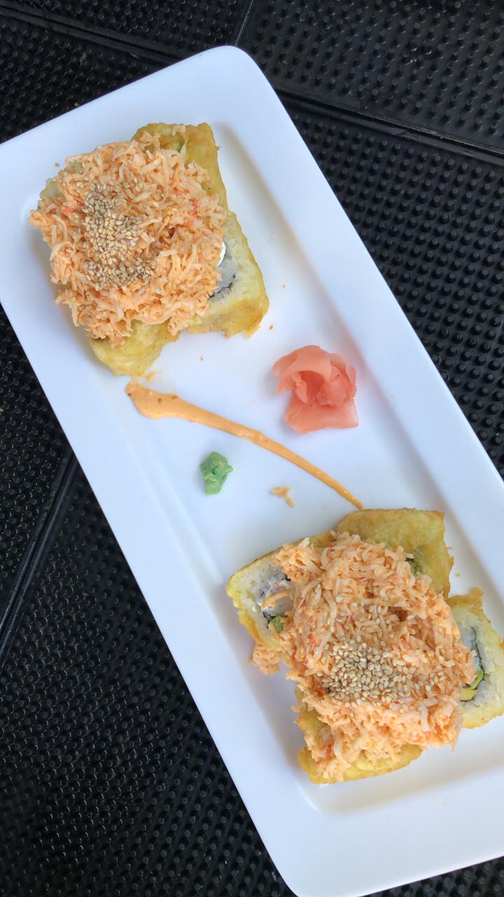 Surimi, camarón capeado,aguacate y queso , por fuera atun masago,spicy con zanahorias curtidas bañadas en salsa dulce