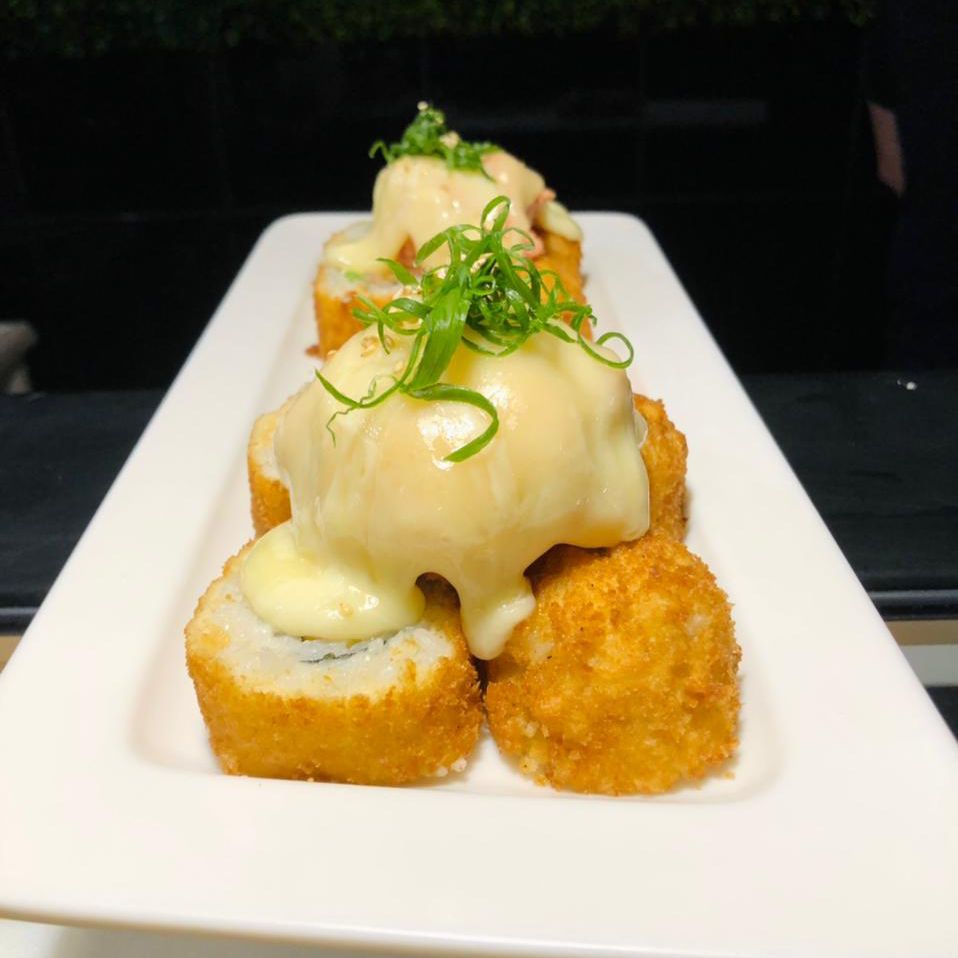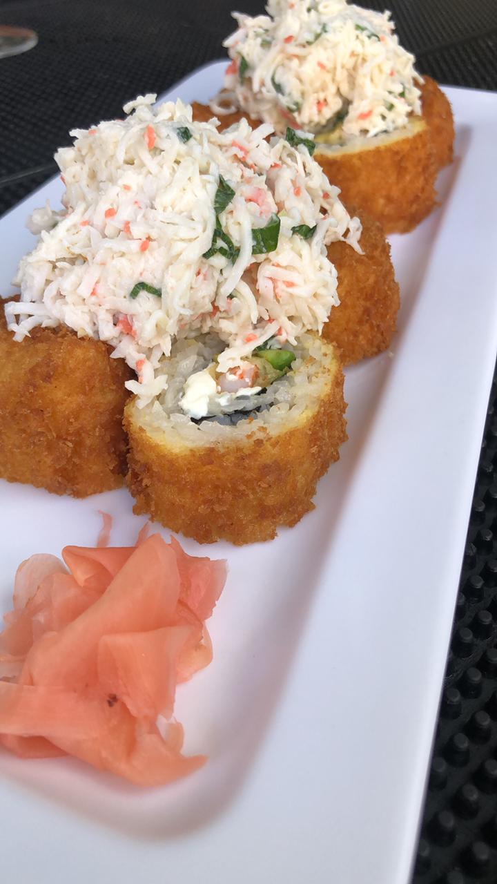 Por dentro camaron y aguacate por fuera queso gratinado con stick de cangrejo
