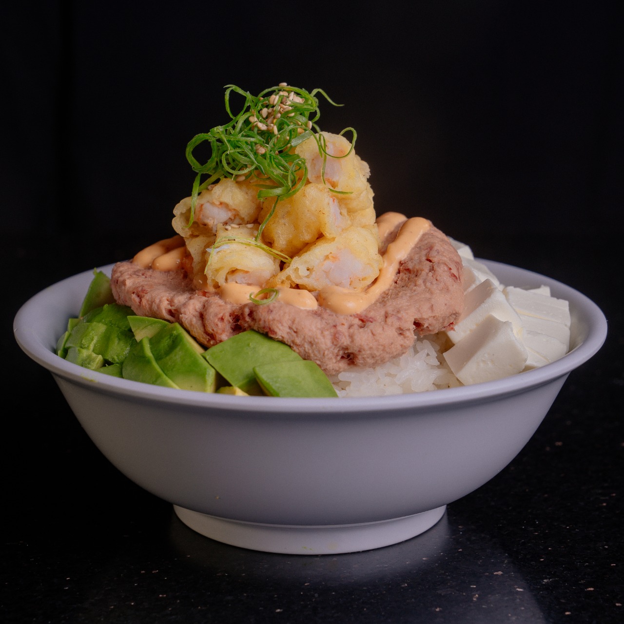 Aguacate, queso, pollo y camarón, con toping de jaiba spicy