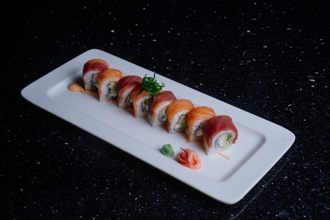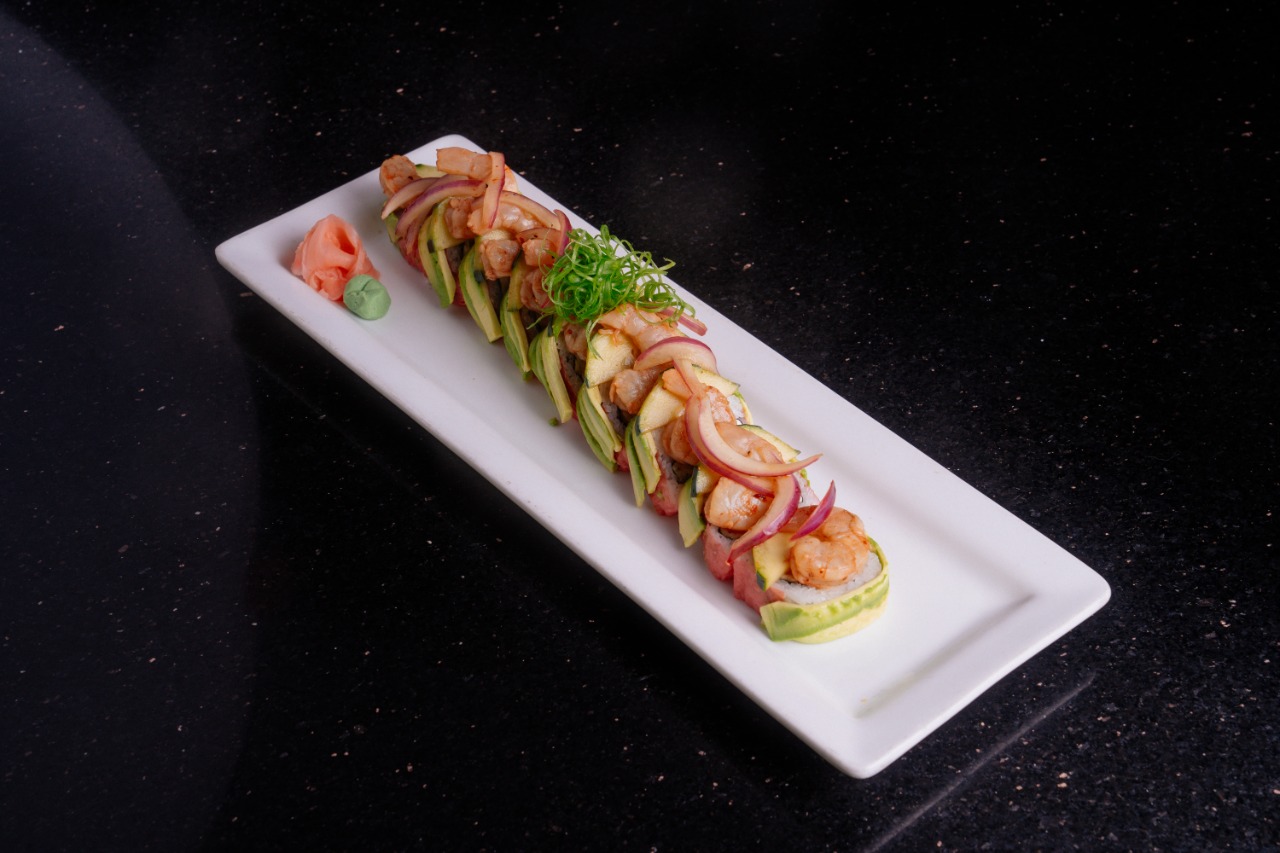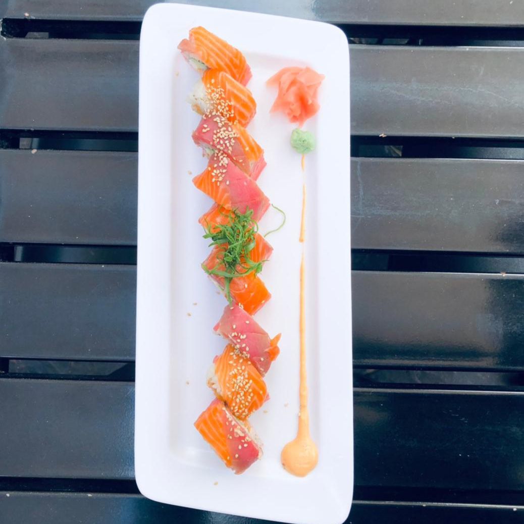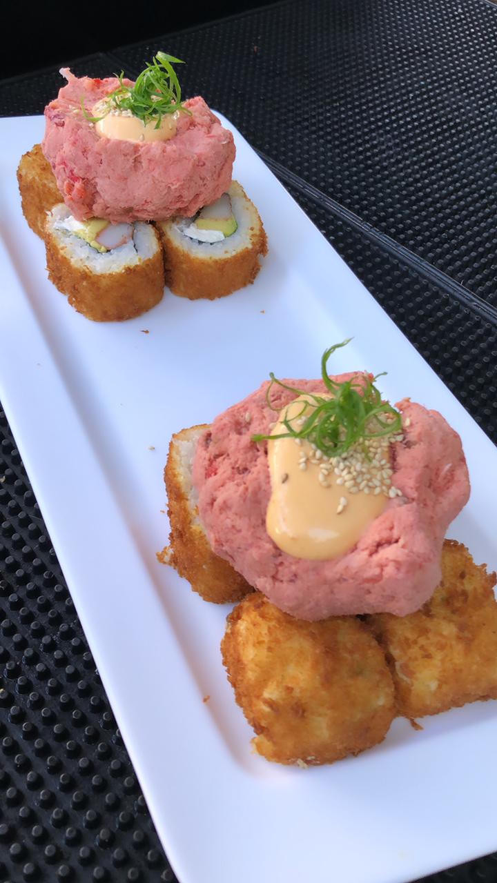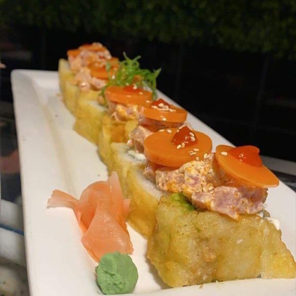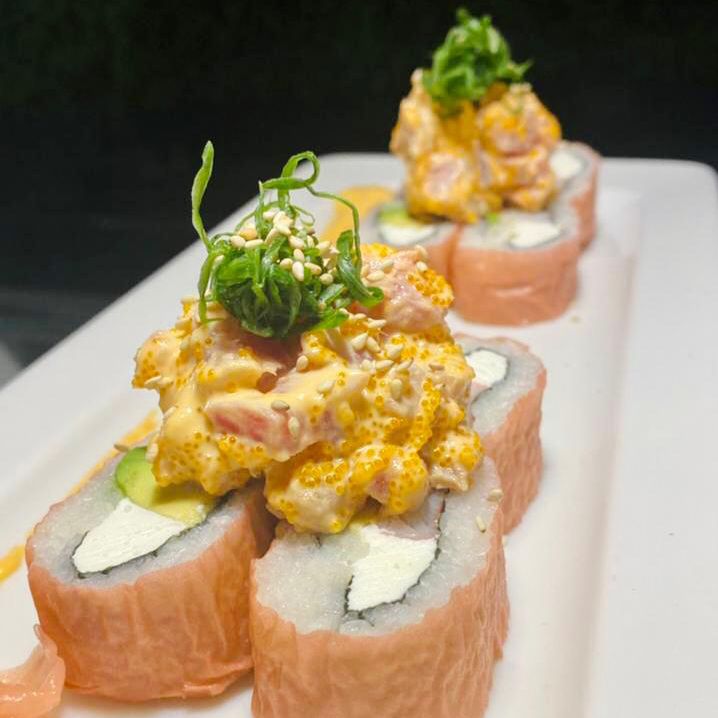 Cangrejo, aguacate, queso, forrado de salmón, encima atún spicy con rodajas de zanahoria curtida