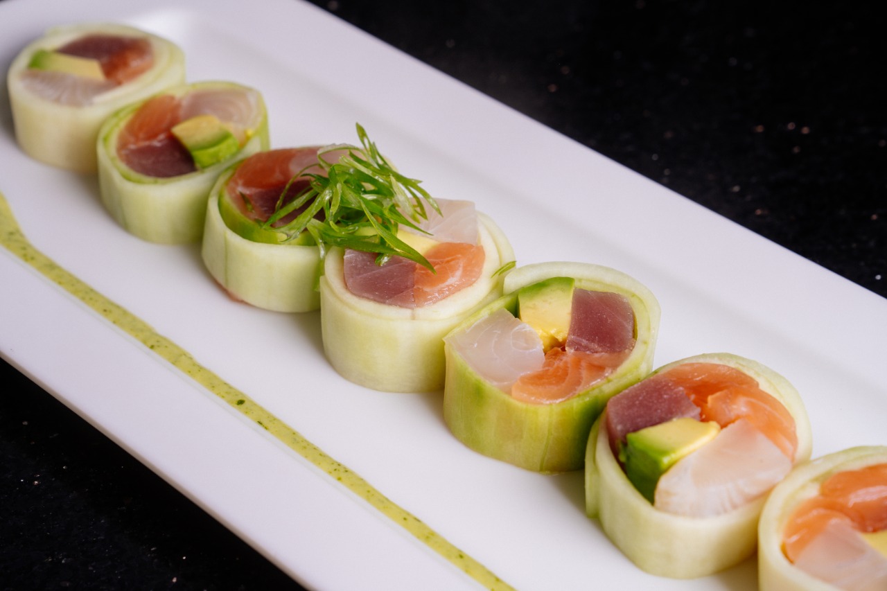 Salmon, atun, pez blanco y aguacate forrado de pepino