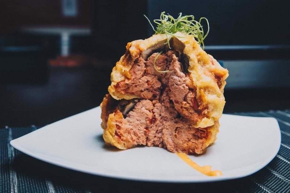 Cangrejo camaron capeado y aguacate forrado de queso y piña,bañado en crema de coco