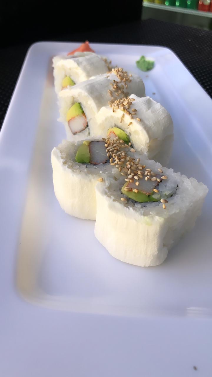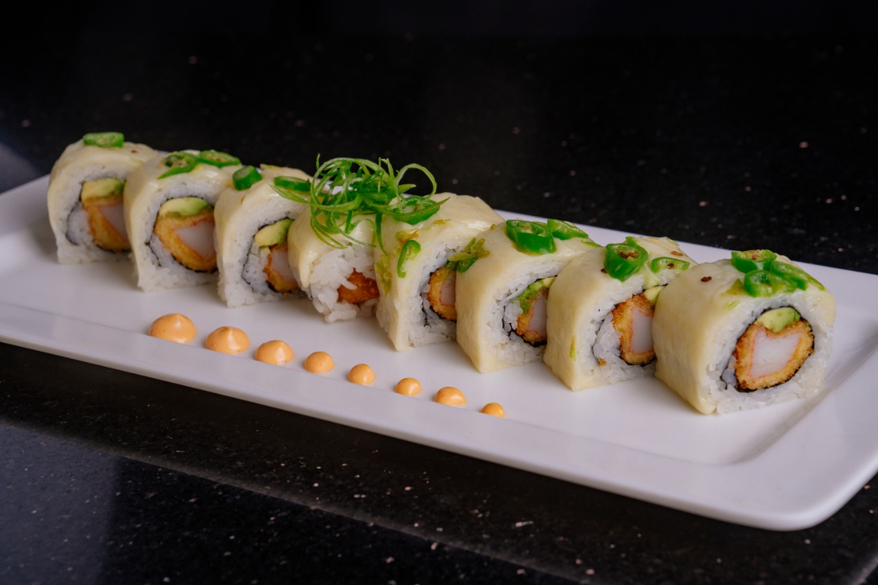 Cangrejo, camaron capeado, aguacate y queso, forrado en alga de soya