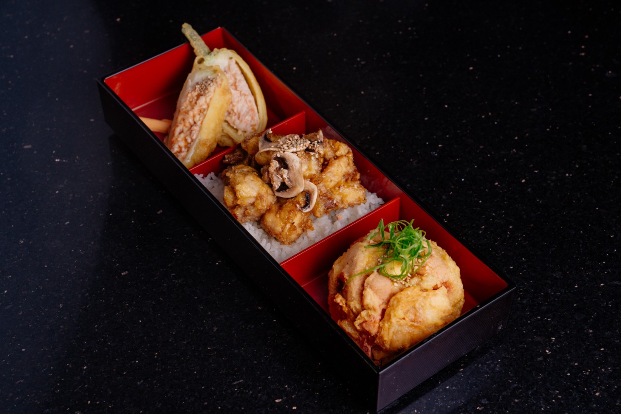 Tampico, camaron aguacate y queso forrado en alga de soya, acompañado de ceviche de mariscos
