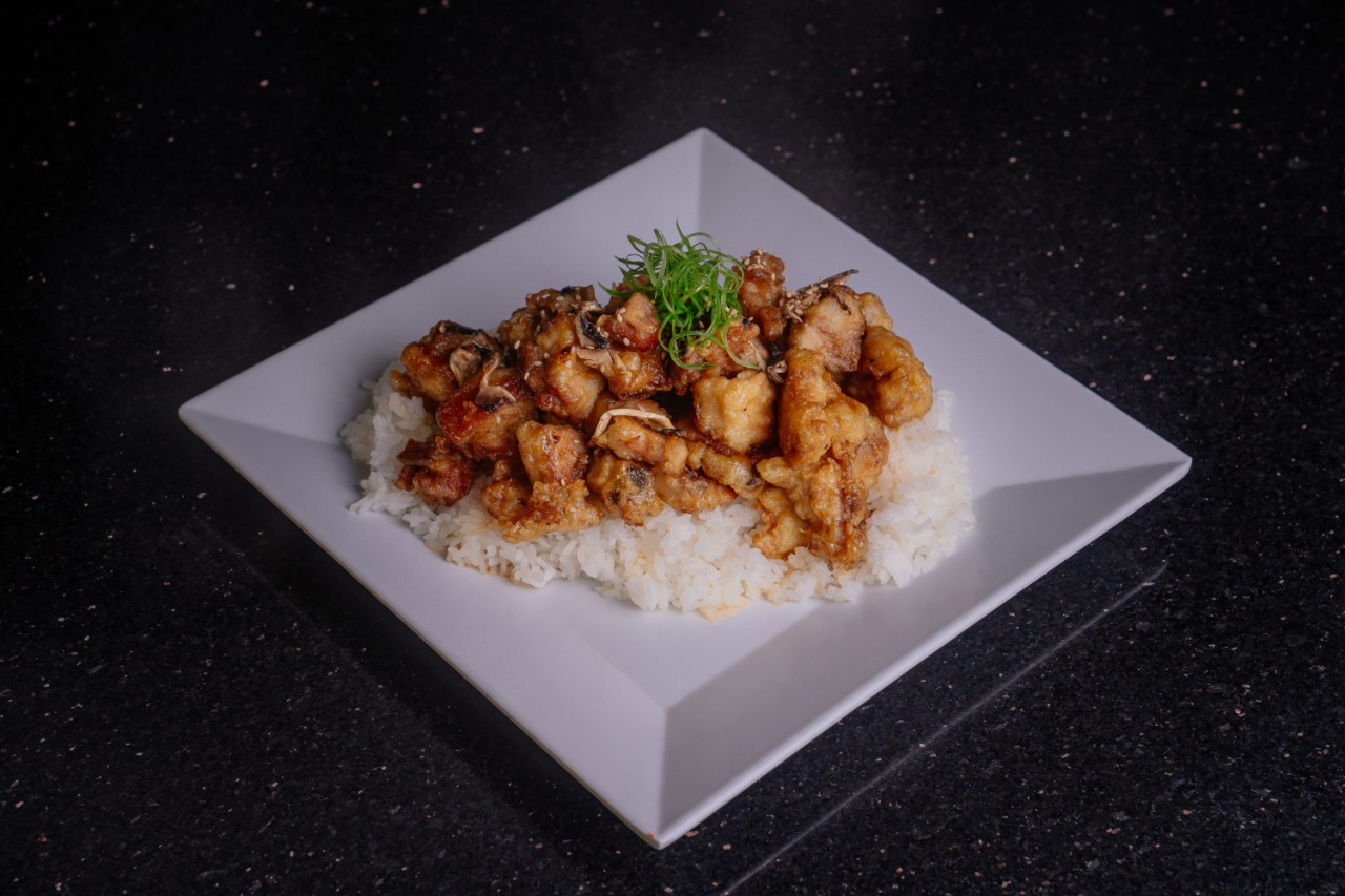 Pollo Capeado bañado en salsa dulce y champiñones sobre cama de arroz