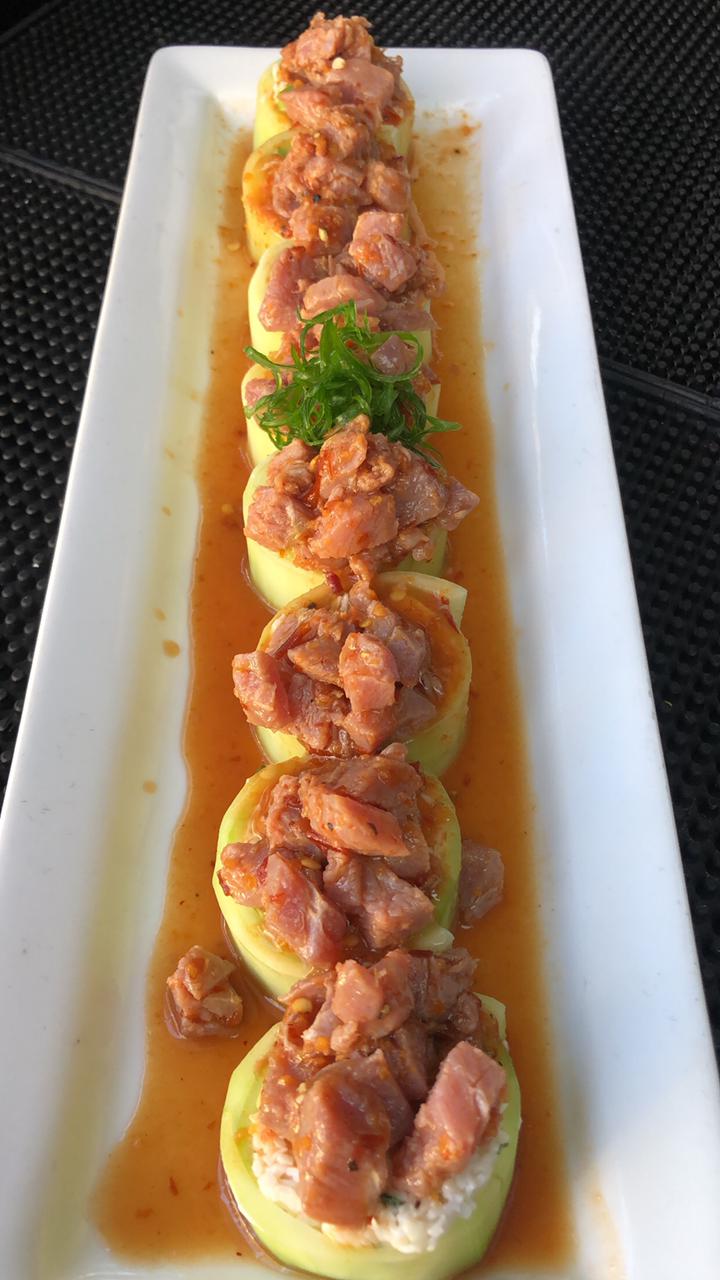 Aguacate, queso, camaron, surimi, forrado de pepino, encima ceviche de atun, sobre salsa carpaccio