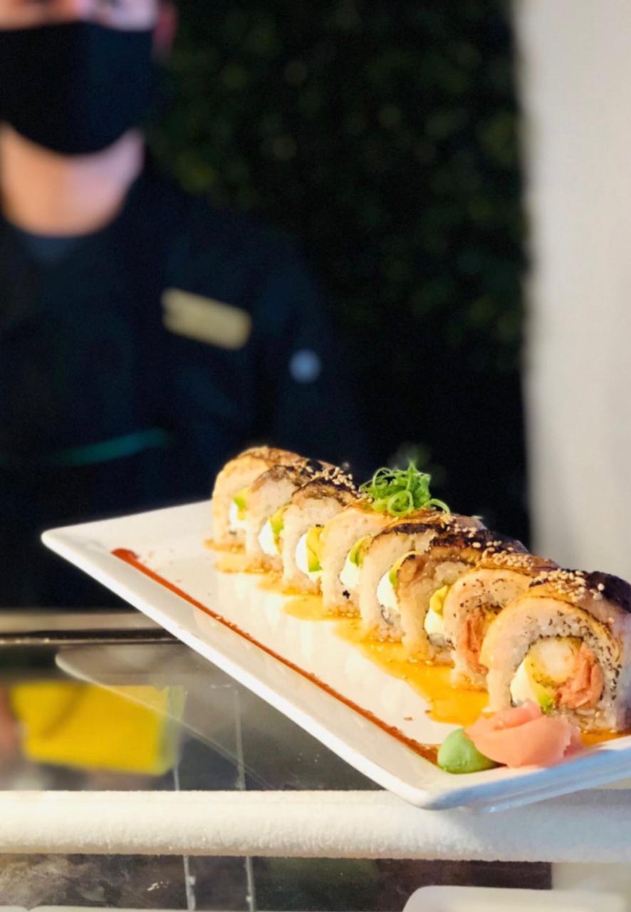 Por dentro camarón, marlin, aguacate y queso por fuera salmon y anguila flameados