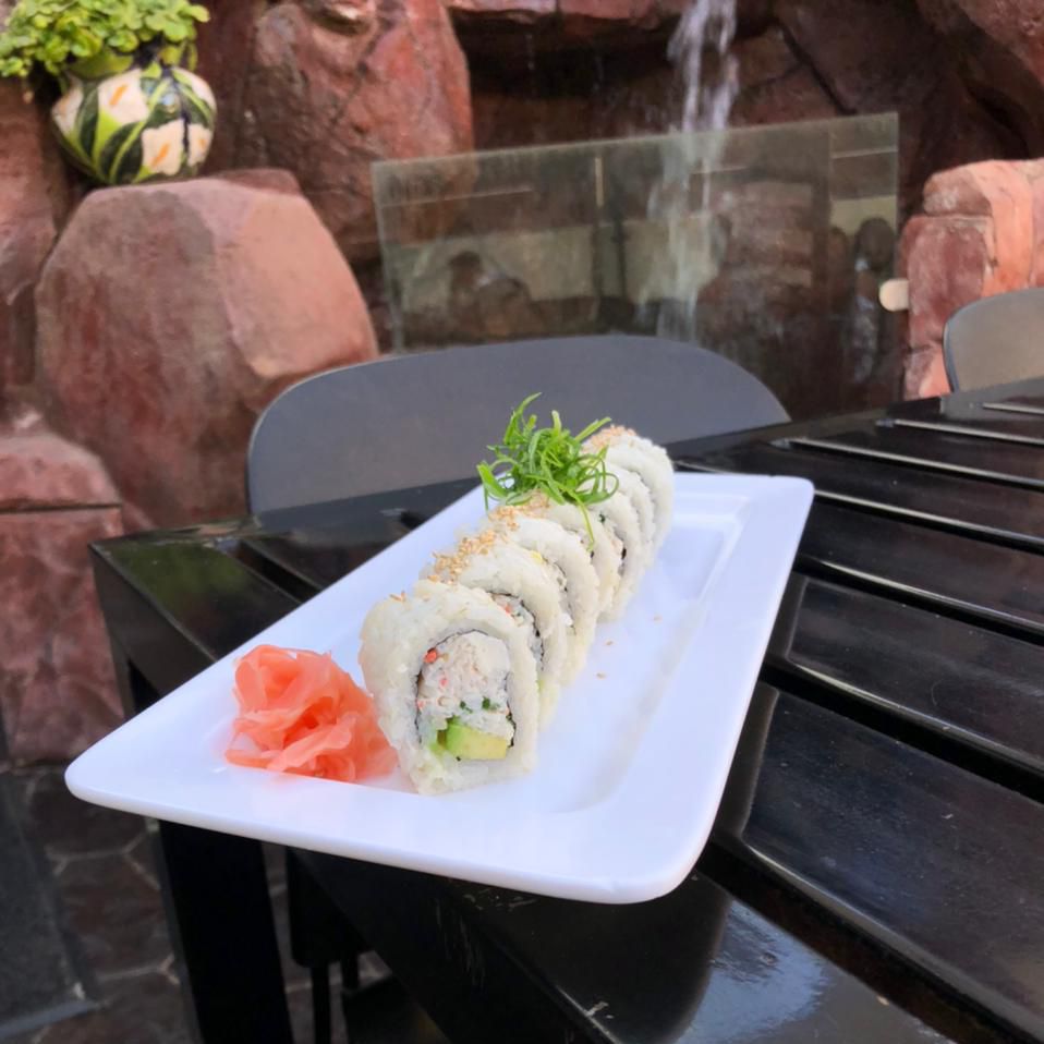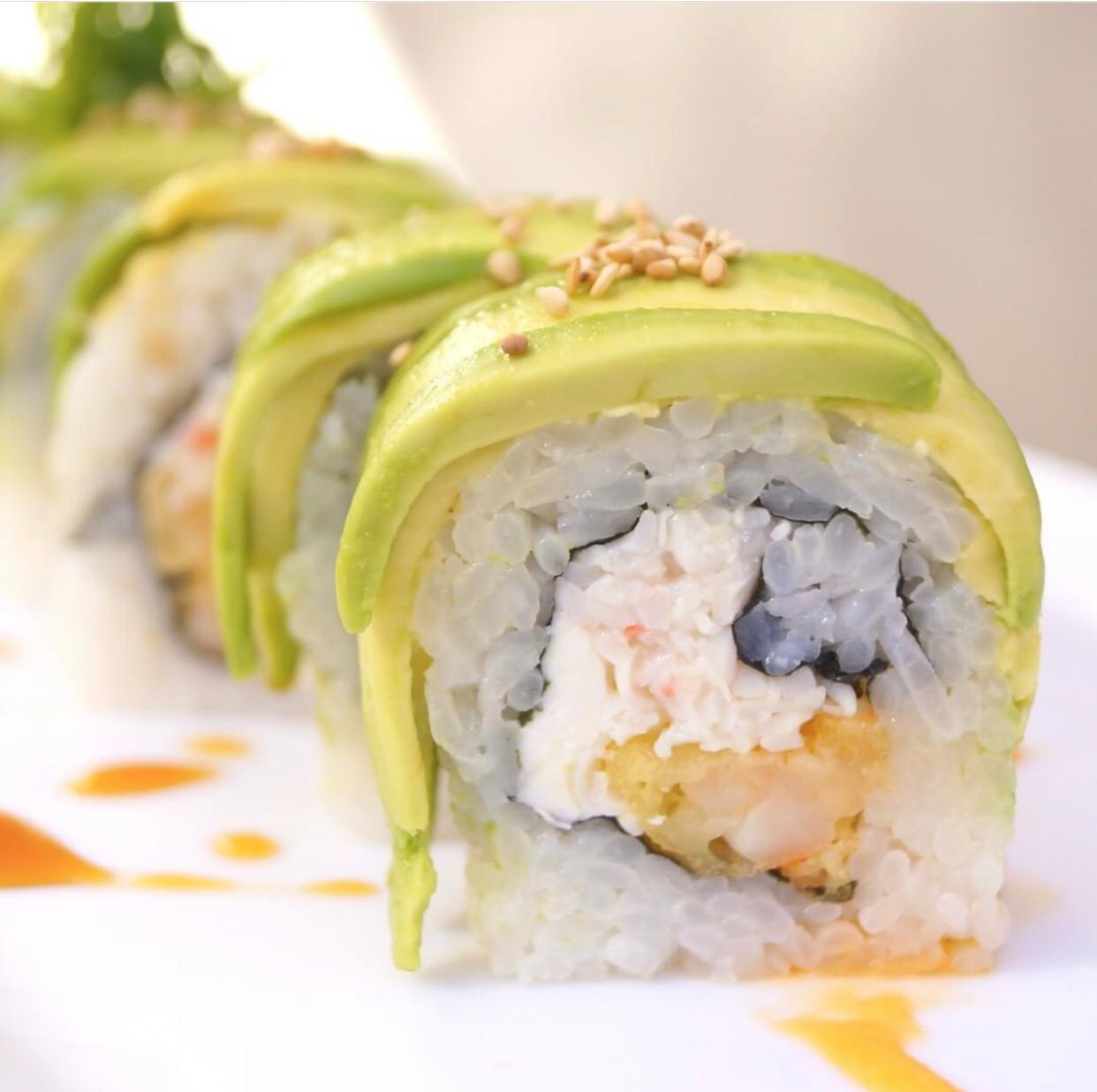 cangrejo, camaron tempura y queso, forrado de aguacate