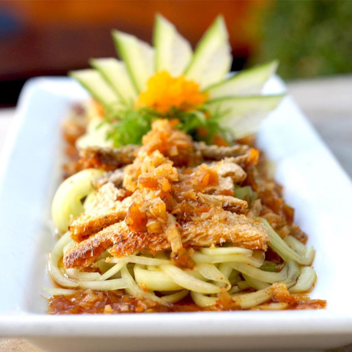 Láminas de atún Sobre cama de pepino, bañada en salsa de citricos de la casa.