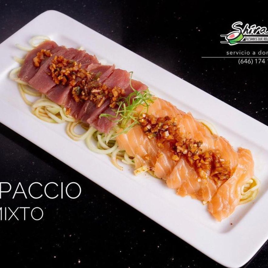 Láminas de atún y salmón, Sobre cama de pepino, bañada en salsa de citricos de la casa.