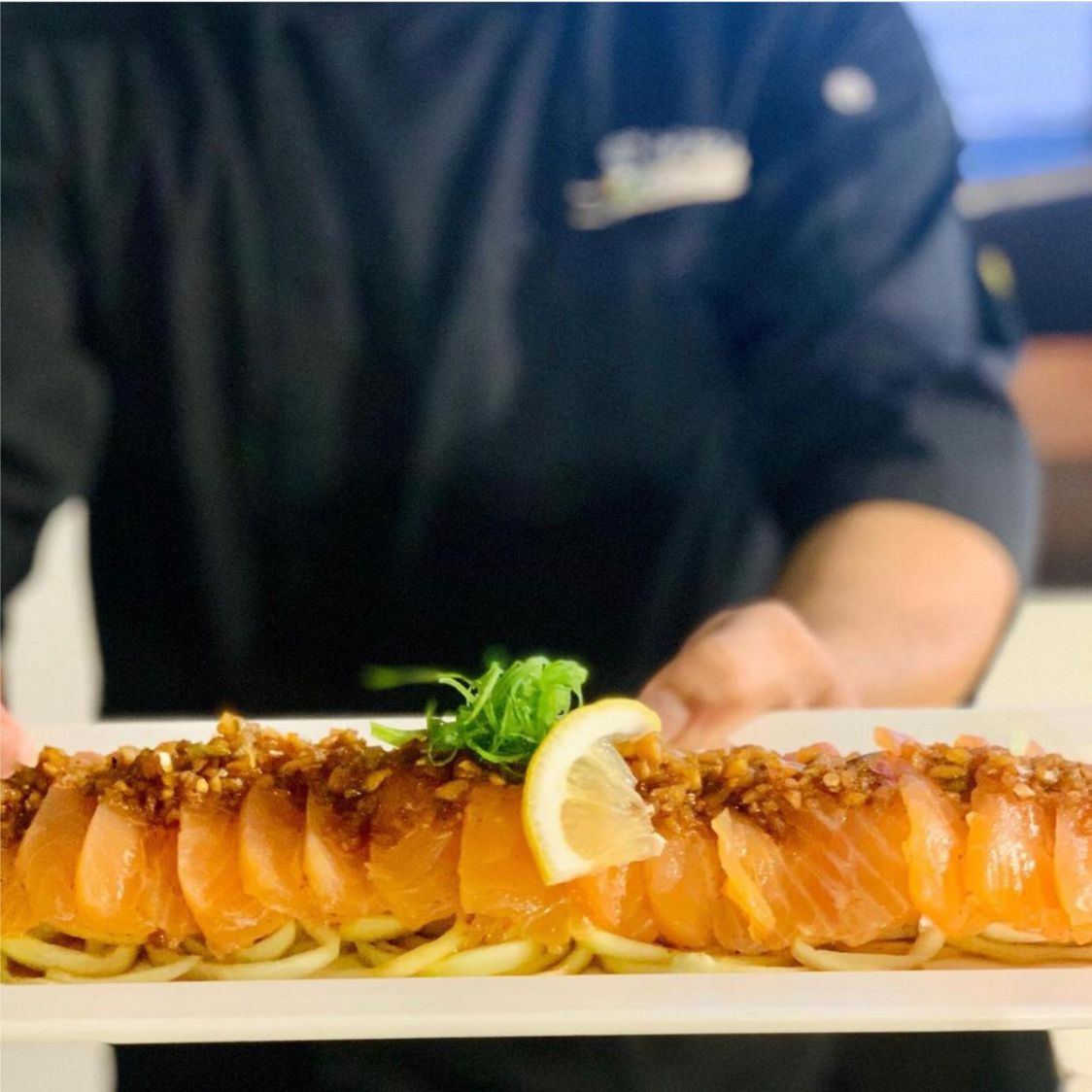 Láminas de salmón Sobre cama de pepino, bañada en salsa de citricos de la casa.