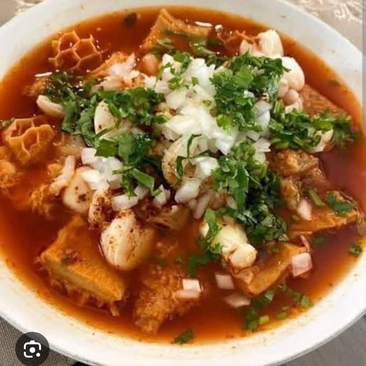 Caldo espeso de pancita de res porción grande de menudo.